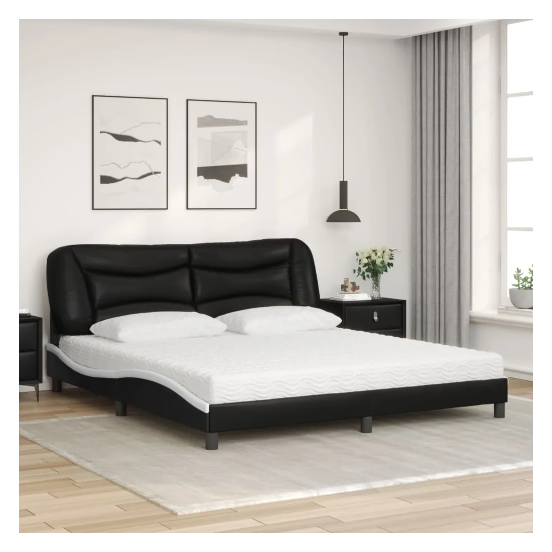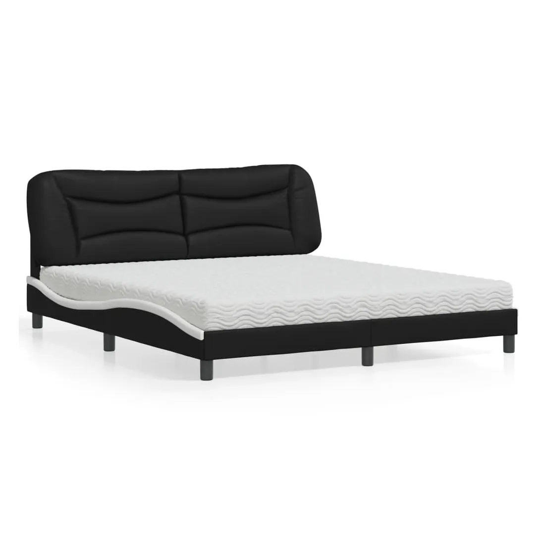 Obtenez une meilleure nuit de sommeil reposante grâce à ce lit avec matelas ! Il est un supplément accueillant à toute chambre à coucher. Similicuir durable : le similicuir de qualité supérieure est un matériau très durable. Il est résistant aux taches, ce qui le rend facile à nettoyer avec un chiffon humide. La surface lisse donne également un aspect luxueux et la beauté du cuir véritable.Lattes de contreplaqué : les lattes de contreplaqué assurent une bonne répartition du poids, garantissant que le matelas reste en place à chaque torsion de votre corps pendant le sommeil.Excellent soutien : la tête de lit vous offre un excellent soutien du dos lorsque vous êtes assis dans votre lit pour lire ou regarder la télévision.Matelas en mousse : ce matelas de lit en tissu à 3 couches est rempli de mousse PU 22D pour un confort optimal. Il contribue à soulager la fatigue et à favoriser la circulation sanguine, vous offrant ainsi une relaxation complète et une bonne qualité de sommeil. En outre, le matelas est disponible en dureté H2 et H3, de sorte que vous pouvez simplement tourner le matelas pour choisir la dureté qui vous convient le mieux.Design latéral ondulé : l’aspect ondulé du cadre de lit est élégant et sophistiqué, ajoutant une touche moderne et élégante à votre décor, ce qui en fait le point central de votre chambre à coucher.