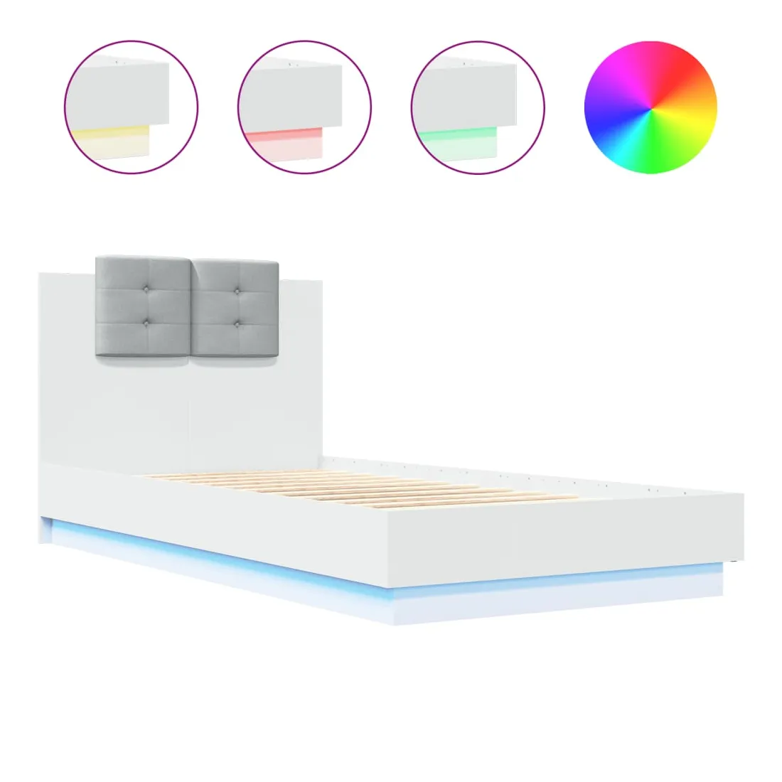 Obtenez une meilleure nuit de sommeil reposante grâce à ce cadre de lit avec tête de lit et lumières LED ! Il est un supplément accueillant à toute chambre à coucher. Matériau durable : le bois d'ingénierie est d'une qualité exceptionnelle avec une surface lisse et présente également résistance, stabilité et résistance à l'humidité.Lumières LED RVB : le cadre de lit est équipé de lumières LED RVB vibrantes. Avec divers menus personnalisables, vous pouvez changer sans effort la couleur des lumières et même les régler automatiquement. Ces lumières LED renforcent non seulement l'aspect contemporain du sommier, mais ajoutent également à son attrait tendance.Excellent soutien : la tête de lit vous offre un excellent soutien du dos lorsque vous êtes assis dans votre lit pour lire ou regarder la télévision.Lattes robustes : les lattes de contreplaqué assurent une bonne répartition du poids, garantissant que le matelas reste en place à chaque torsion de votre corps pendant le sommeil. Bon à savoir :Un matelas n'est pas inclus avec ce lit. Nous offrons une sélection variée de matelas. Vous pouvez consulter notre boutique pour trouver un matelas assorti.Ce produit est doté d'un connecteur USB qui nécessite une source d'alimentation USB de 5V certifiée (non incluse).