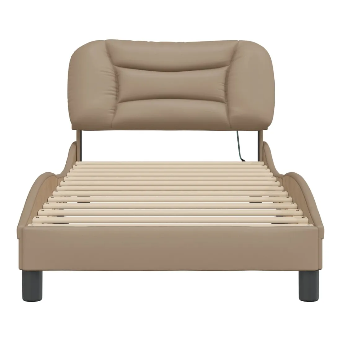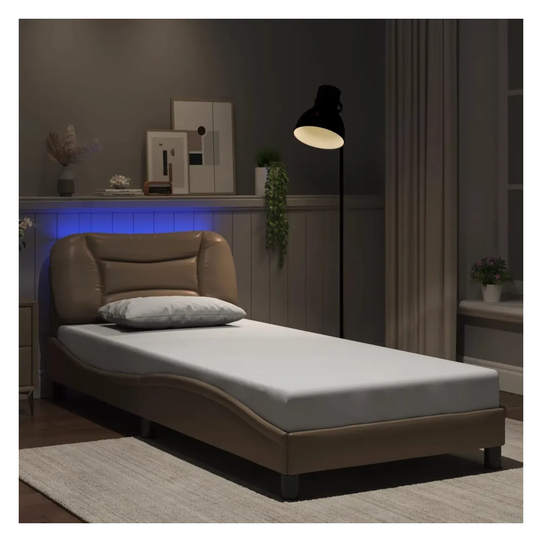 Obtenez une meilleure nuit de sommeil reposante grâce à ce cadre de lit avec lumières LED ! Il est un supplément accueillant à toute chambre à coucher. Similicuir durable : le similicuir de qualité supérieure est un matériau très durable. Il est résistant aux taches, ce qui le rend facile à nettoyer avec un chiffon humide. La surface lisse donne également un aspect luxueux et la beauté du cuir véritable.Lattes de contreplaqué : les lattes de contreplaqué assurent une bonne répartition du poids, garantissant que le matelas reste en place à chaque torsion de votre corps pendant le sommeil.Excellent soutien : la tête de lit vous offre un excellent soutien du dos lorsque vous êtes assis dans votre lit pour lire ou regarder la télévision.Bande LED colorée : apportez de la gaieté dans l'obscurité avec des lumières LED colorées ! Les bandes auto-agrippantes situées à l'arrière du coussin de la tête de lit peuvent être utilisées pour fixer les lumières LED.Design latéral ondulé : l’aspect ondulé du cadre de lit est élégant et sophistiqué, ajoutant une touche moderne et élégante à votre décor, ce qui en fait le point central de votre chambre à coucher. Bon à savoir :Un matelas n'est pas inclus avec ce lit. Nous offrons une sélection variée de matelas. Vous pouvez consulter notre boutique pour trouver un matelas assorti.Ce produit est doté d'un connecteur USB qui nécessite une source d'alimentation USB de 5V certifiée (non incluse).