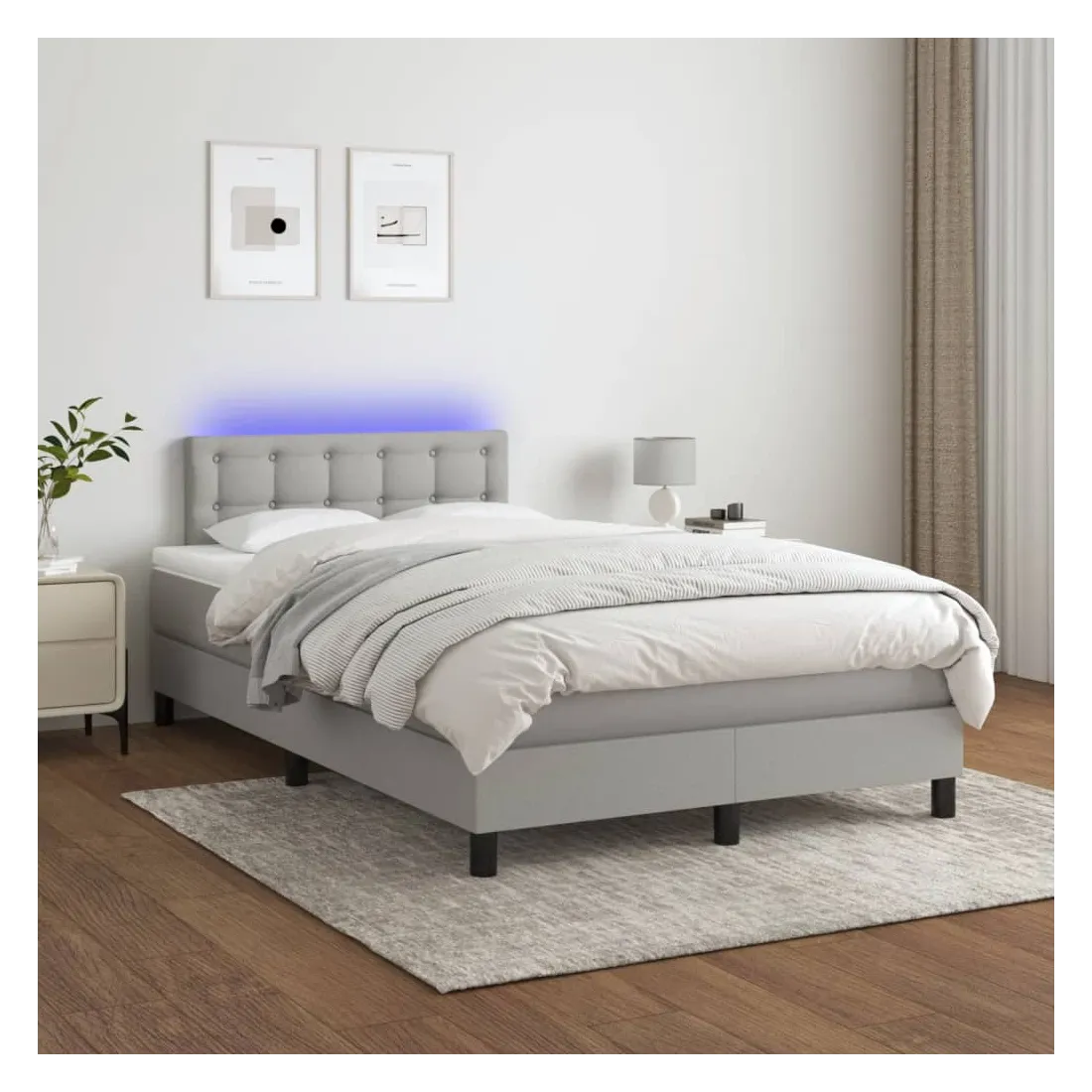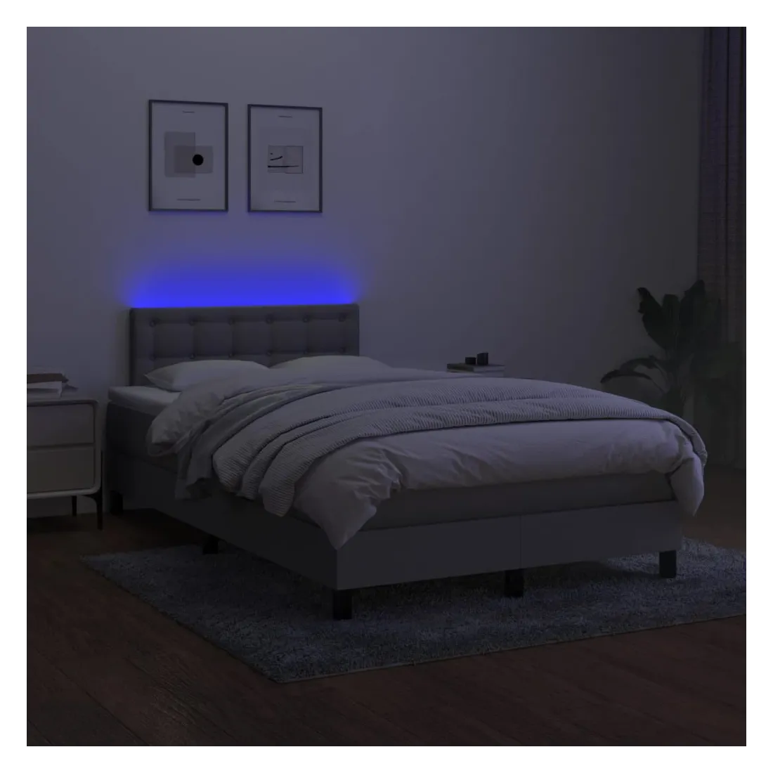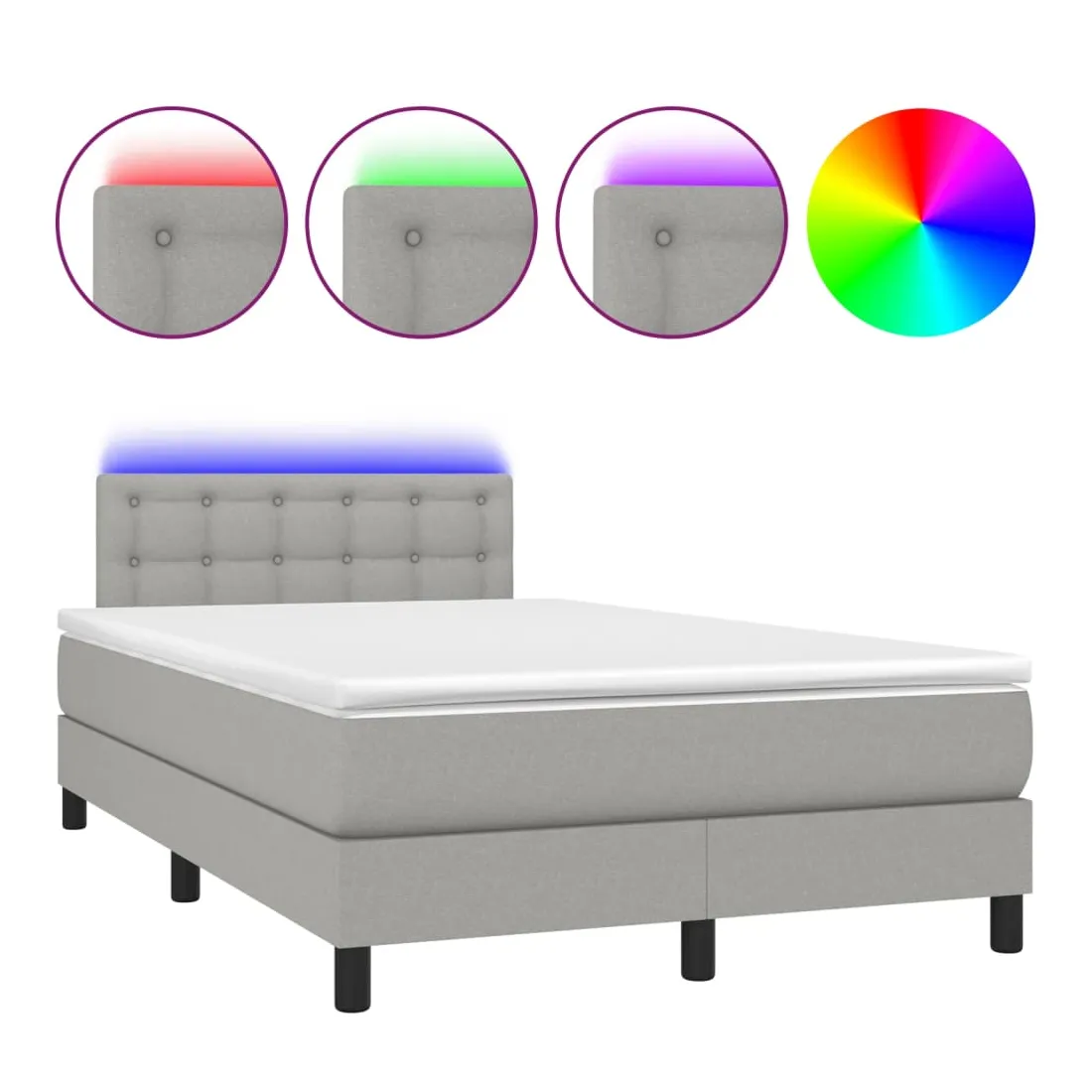 Utilisez ce sommier tapissier avec matelas et LED pour profiter d'un sommeil réparateur ! C'est le point central de votre chambre à coucher. Tissu durable : le tissu présente un aspect simple et épuré, et il est respirant et durable.Tête de lit pratique : la tête de lit est réglable en hauteur selon vos préférences. La tête de lit vous offre un excellent soutien du dos lorsque vous êtes assis dans votre lit pour lire ou regarder la télévision.Bande LED colorée : apportez de l'éclairage dans l'obscurité avec des lumières LED colorées !Matelas à ressorts ensachés : le ressort ensaché individuel intégré est connu pour sa très haute qualité tout en assurant un haut niveau de durabilité et d'adaptabilité. Il peut absorber efficacement le bruit et les chocs causés par les sauts et les rotations.Protège-matelas doux pour la peau : le protège-matelas est recouvert d'un tissu résistant et doux pour la peau, ce qui le rend souple et confortable. Bon à savoir :Pour des raisons d'hygiène, le matelas ne peut pas être retourné si l'emballage est retiré ou ouvert.Seule la partie avec un symbole de ciseaux peut être coupée et seule la partie avec l'USB continuera à fonctionner comme avant.Ce produit est doté d'un connecteur USB qui nécessite une source d'alimentation USB de 5V certifiée (non incluse).