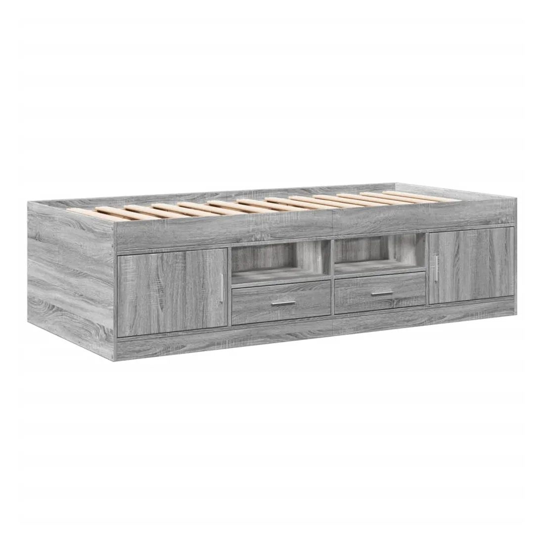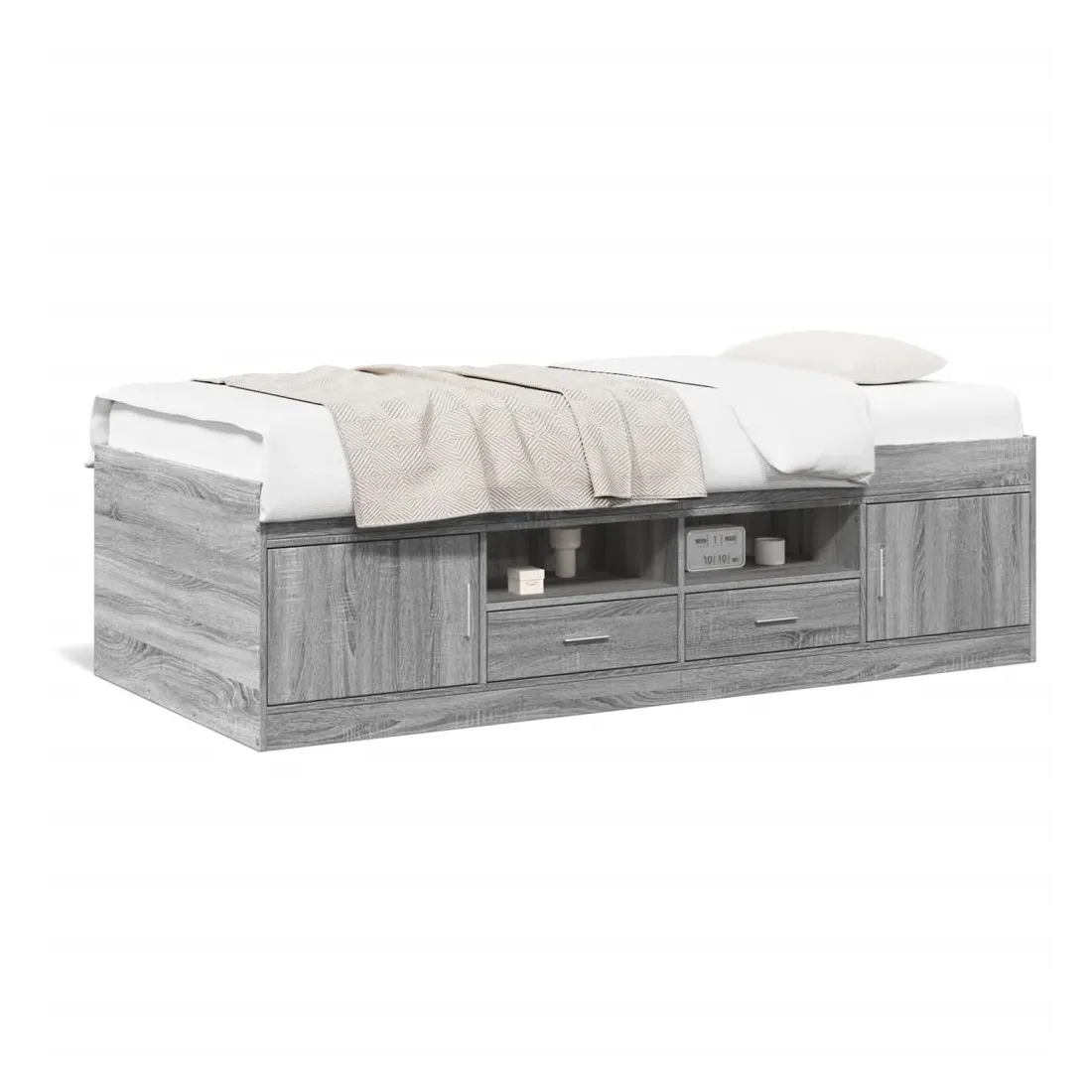 Ce lit de jour polyvalent peut être utilisé non seulement comme lit dans la chambre à coucher, mais aussi comme canapé dans le salon. Il conviendra parfaitement à vos différents besoins, vous offrant beaucoup d'espace pour dormir ou vous reposer. Construction solide : ce canapé-lit est doté d'un cadre robuste en bois d'ingénierie. Le bois d'ingénierie est d'une qualité exceptionnelle avec une surface lisse et se caractérise par sa solidité, sa stabilité et sa résistance à l'humidité.Fonction de rangement : les tiroirs de lit inclus offrent suffisamment d'espace de rangement pour ranger vos articles essentiels, gardant votre pièce propre et bien rangée.Lattes robustes : les lattes de contreplaqué assurent une bonne répartition du poids, garantissant que le matelas reste en place à chaque torsion de votre corps pendant le sommeil. Bon à savoir :Un matelas n'est pas inclus avec ce lit. Nous offrons une sélection variée de matelas. Vous pouvez consulter notre boutique pour trouver un matelas assorti.
