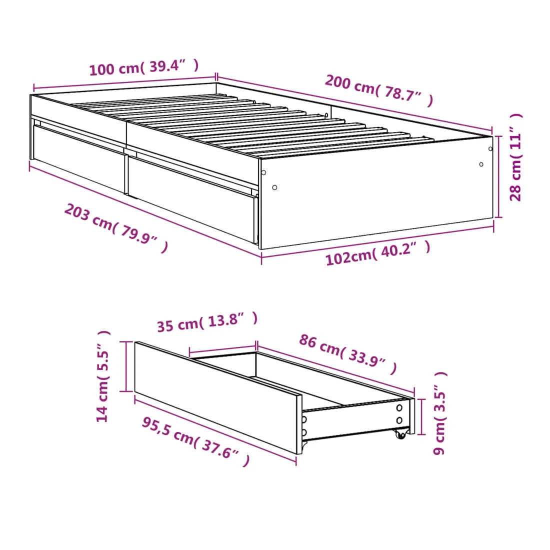 - Dimensions des tiroirs de lit (chacun) : 95,5 x 35 x 14 cm (L x l x H)