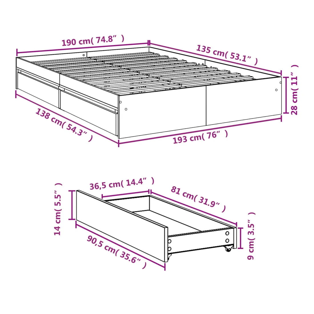 - Dimensions des tiroirs de lit (chacun) : 90,5 x 36,5 x 14 cm (L x l x H)