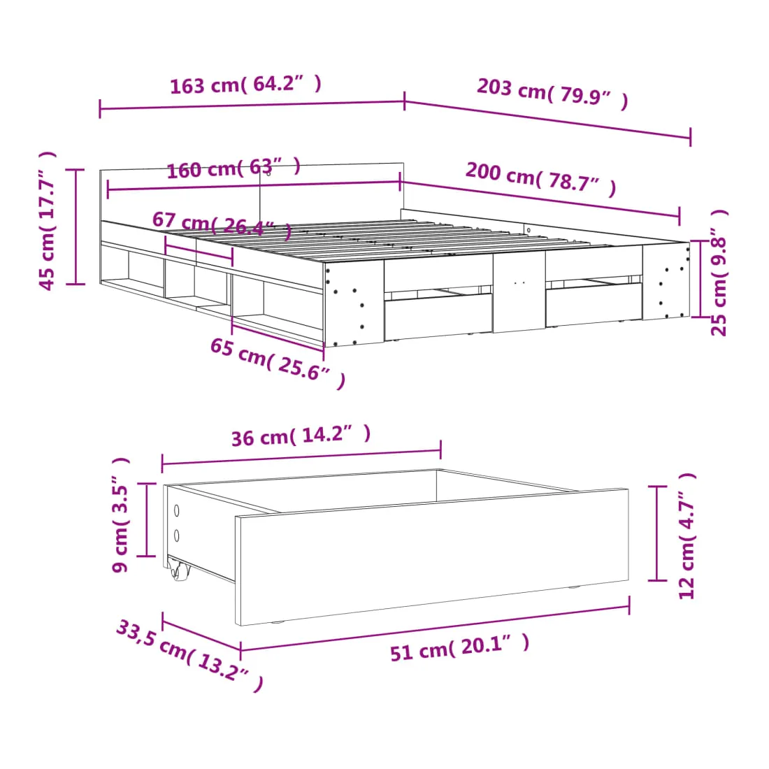 - Dimensions du tiroir de lit (chacun) : 51 x 33,5 x 12 cm (L x l x H)