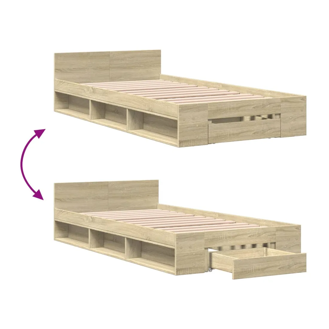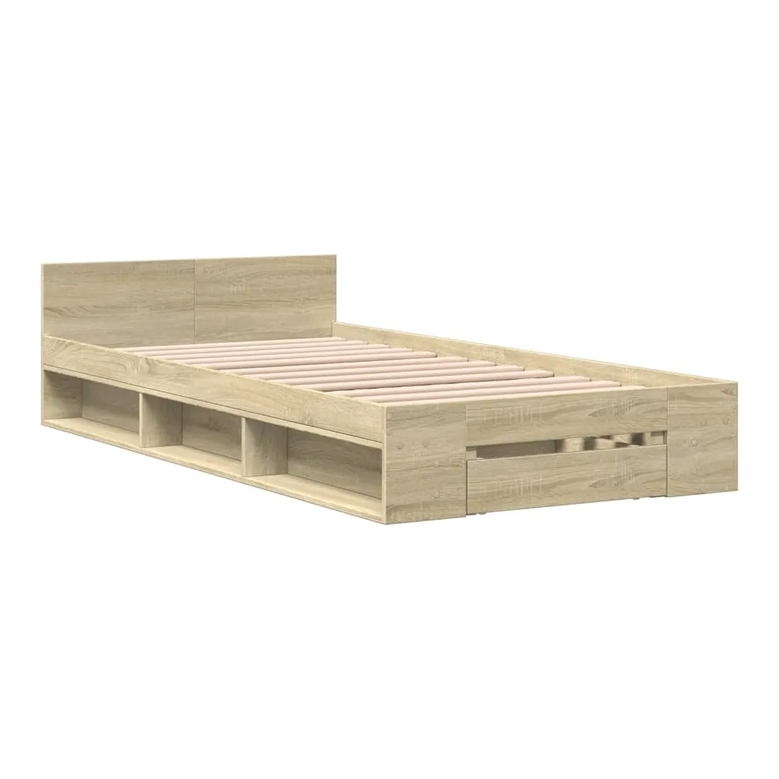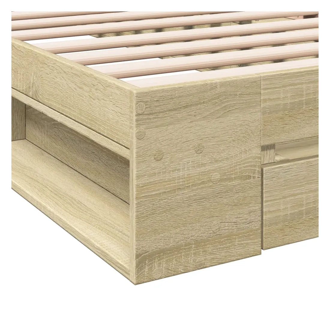 Ajoutez une touche moderne à votre chambre à coucher avec ce cadre de lit avec tiroir ! Il apportera une touche pratique et décorative à votre espace de vie. Matériau durable : le cadre de lit est fabriquée en bois d'ingénierie. Le bois d'ingénierie est d'une qualité exceptionnelle avec une surface lisse et présente également de la résistance, de la stabilité et de la résistance à l'humidité.Lattes robustes : les lattes de contreplaqué assurent une bonne répartition du poids, garantissant que le matelas reste en place à chaque torsion de votre corps pendant le sommeil.Fonction de rangement : le tiroir de lit et les compartiments latéraux inclus offrent suffisamment d'espace de rangement pour ranger vos articles essentiels, gardant votre pièce propre et bien rangée. Bon à savoir :Un matelas n'est pas inclus avec ce lit. Nous offrons une sélection variée de matelas. Vous pouvez consulter notre boutique pour trouver un matelas assorti.