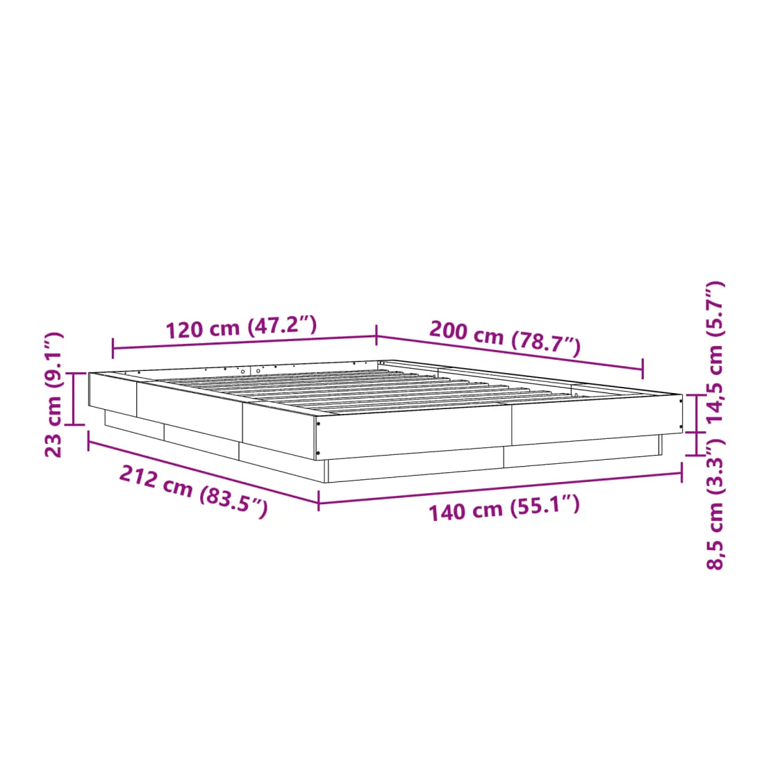 - Dimensions totales : 212 x 140 x 23 cm (L x l x H)