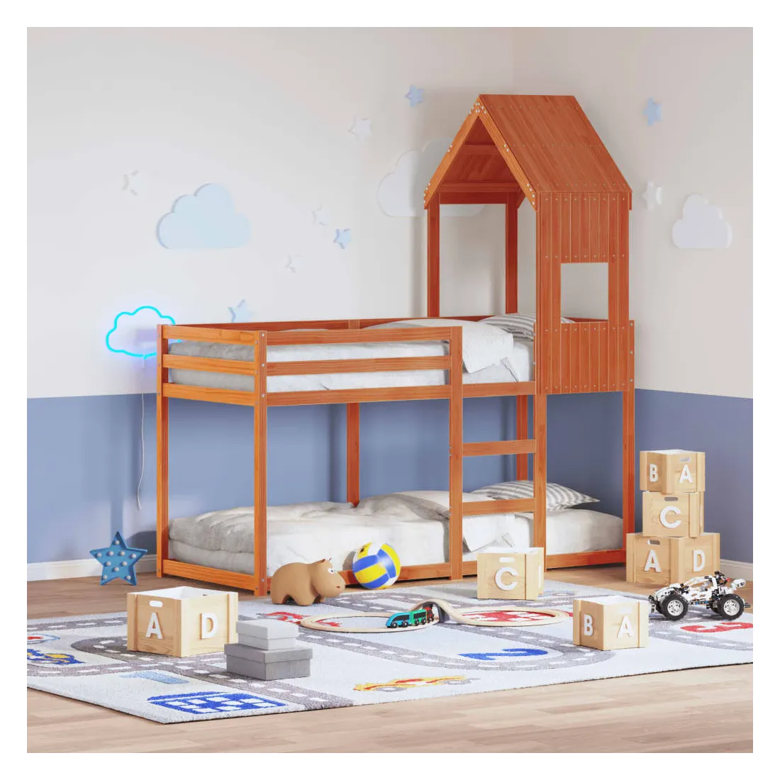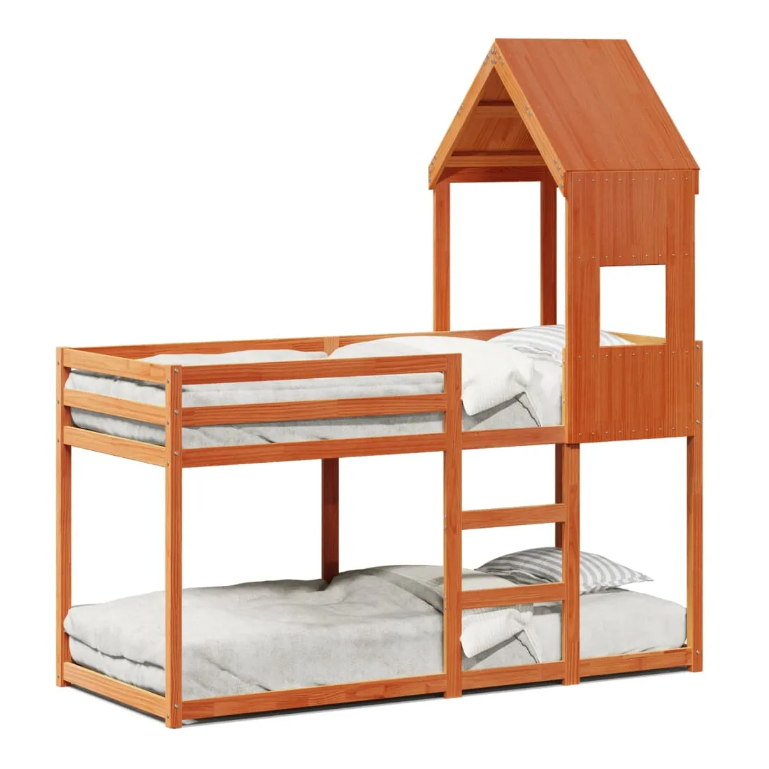 Ce lit superposé pour enfants avec toit est élégant et fonctionnel, ce qui en fait un ajout parfait à toute pièce avec un espace limité. Bois de pin massif : le bois de pin massif est un matériau naturel magnifique. Le bois de pin a un grain droit et les nœuds donnent au matériau son aspect caractéristique et rustique.Design sûr : le lit surélevé est conçu dans un souci de sécurité. Il comprend des garde-corps qui empêchent l'utilisateur de rouler pendant son sommeil.Lattes de contreplaqué : les lattes de contreplaqué assurent une bonne répartition du poids, garantissant que le matelas reste en place à chaque torsion de votre corps pendant le sommeil.Très amusant : en combinant le toit avec le lit de votre enfant, vous pouvez créer une cachette qui permettra à votre enfant de s'amuser à l'heure du coucher. Cette addition innovante non seulement sera un point focal passionnant, mais aussi apportera de la fantaisie et de l'amusement dans la chambre d'enfant.Convient aux espaces limités : le cadre de lit est un excellent choix pour toute pièce dont l'espace est limité, il fournit deux lits individuels avec un design compact.Porte latérale ouverte : le toit est doté d'une porte latérale ouverte qui permet à vos enfants d'entrer et de sortir facilement du lit. Bon à savoir :Un matelas n'est pas inclus avec ce lit. Nous offrons une sélection variée de matelas. Vous pouvez consulter notre boutique pour trouver un matelas assorti.
