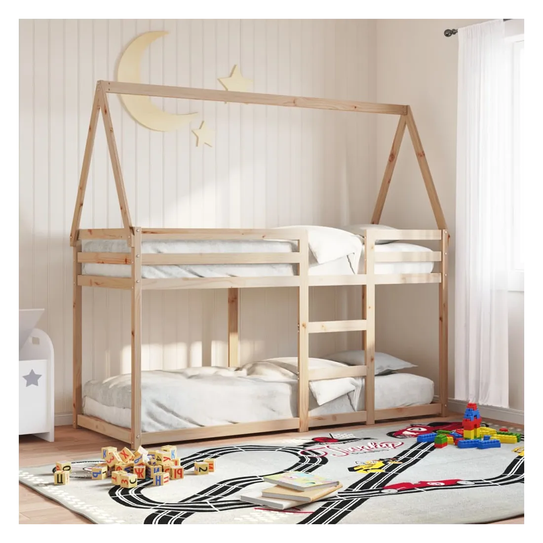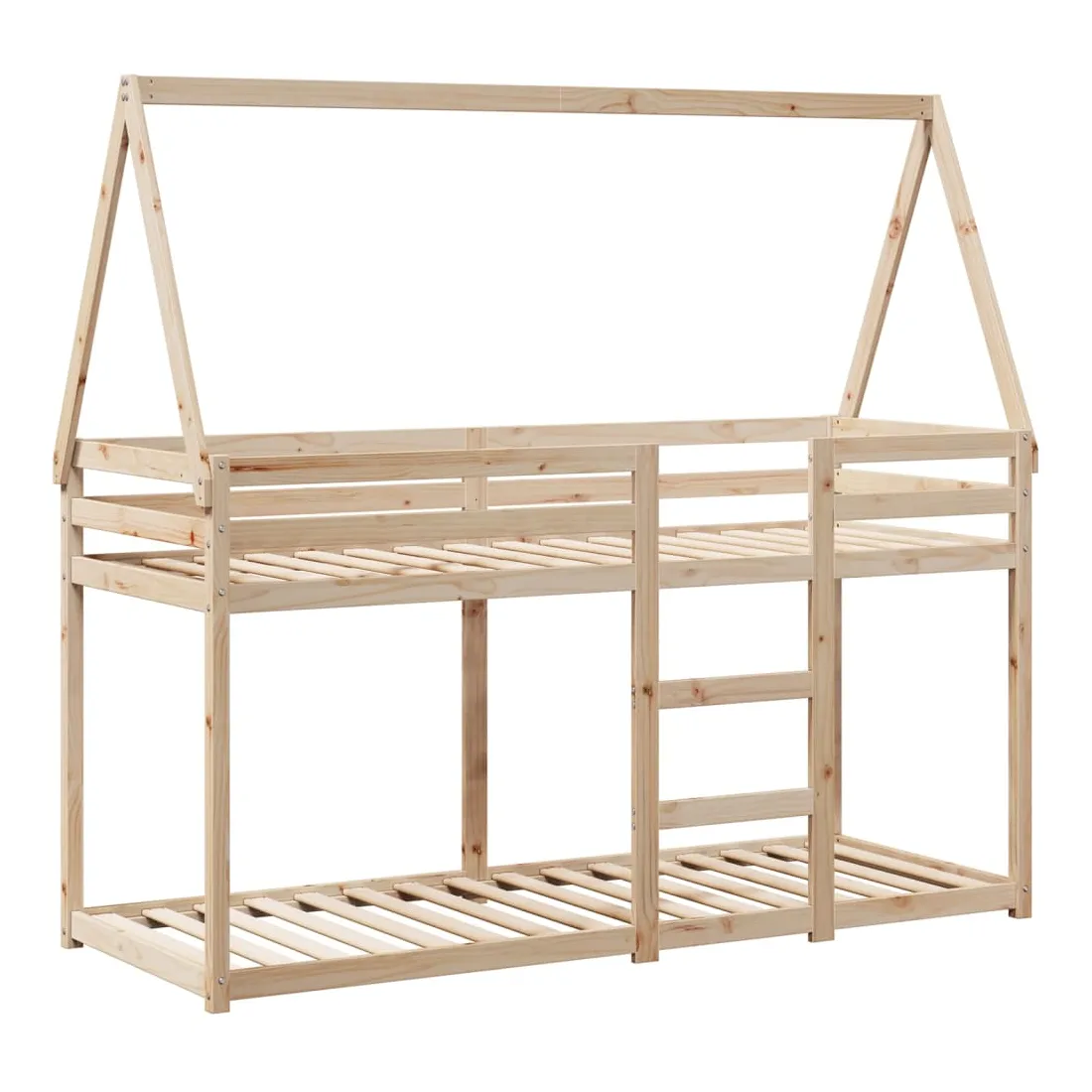 Ce lit superposé pour enfants avec toit est élégant et fonctionnel, ce qui en fait un ajout parfait à toute pièce avec un espace limité. Bois de pin massif : le bois de pin massif est un matériau naturel magnifique. Le bois de pin a un grain droit et les nœuds donnent au matériau son aspect caractéristique et rustique.Design sûr : le lit surélevé est conçu dans un souci de sécurité. Il comprend des garde-corps qui empêchent l'utilisateur de rouler pendant son sommeil.Lattes de contreplaqué : les lattes de contreplaqué assurent une bonne répartition du poids, garantissant que le matelas reste en place à chaque torsion de votre corps pendant le sommeil.Très amusant : en combinant le toit avec le lit de votre enfant, vous pouvez créer une cachette qui permettra à votre enfant de s'amuser à l'heure du coucher. Cette addition innovante non seulement sera un point focal passionnant, mais aussi apportera de la fantaisie et de l'amusement dans la chambre d'enfant.Convient aux espaces limités : le cadre de lit est un excellent choix pour toute pièce dont l'espace est limité, il fournit deux lits individuels avec un design compact.Porte latérale ouverte : le toit est doté d'une porte latérale ouverte qui permet à vos enfants d'entrer et de sortir facilement du lit. Bon à savoir :Un matelas n'est pas inclus avec ce lit. Nous offrons une sélection variée de matelas. Vous pouvez consulter notre boutique pour trouver un matelas assorti.