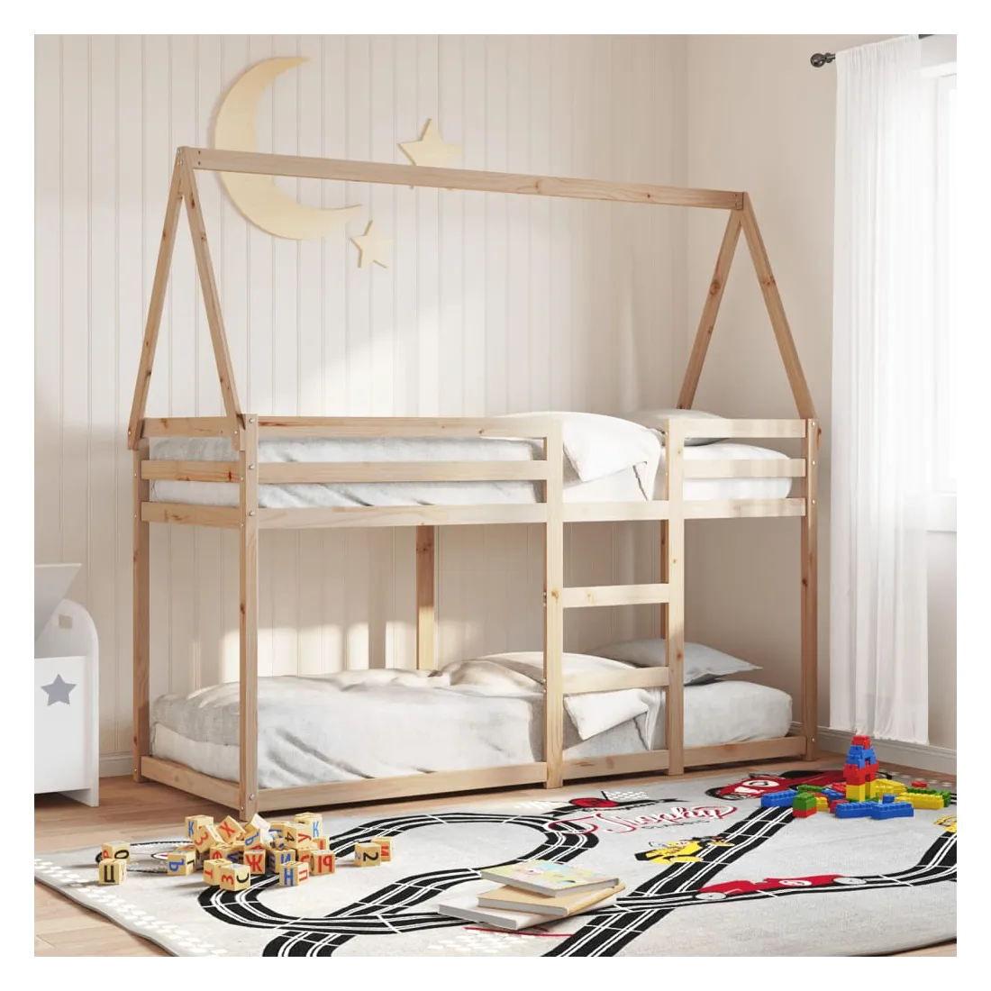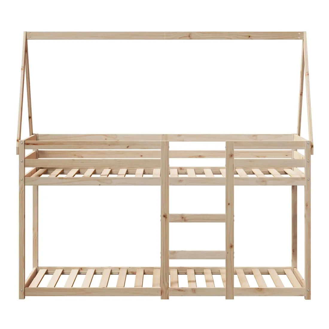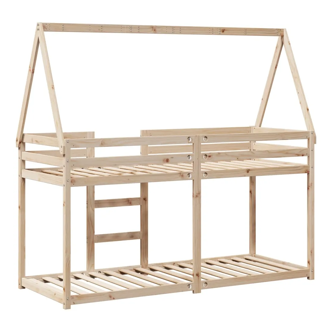 Ce lit superposé pour enfants avec toit est élégant et fonctionnel, ce qui en fait un ajout parfait à toute pièce avec un espace limité. Bois de pin massif : le bois de pin massif est un matériau naturel magnifique. Le bois de pin a un grain droit et les nœuds donnent au matériau son aspect caractéristique et rustique.Design sûr : le lit surélevé est conçu dans un souci de sécurité. Il comprend des garde-corps qui empêchent l'utilisateur de rouler pendant son sommeil.Lattes de contreplaqué : les lattes de contreplaqué assurent une bonne répartition du poids, garantissant que le matelas reste en place à chaque torsion de votre corps pendant le sommeil.Très amusant : en combinant le toit avec le lit de votre enfant, vous pouvez créer une cachette qui permettra à votre enfant de s'amuser à l'heure du coucher. Cette addition innovante non seulement sera un point focal passionnant, mais aussi apportera de la fantaisie et de l'amusement dans la chambre d'enfant.Convient aux espaces limités : le cadre de lit est un excellent choix pour toute pièce dont l'espace est limité, il fournit deux lits individuels avec un design compact.Porte latérale ouverte : le toit est doté d'une porte latérale ouverte qui permet à vos enfants d'entrer et de sortir facilement du lit. Bon à savoir :Un matelas n'est pas inclus avec ce lit. Nous offrons une sélection variée de matelas. Vous pouvez consulter notre boutique pour trouver un matelas assorti.
