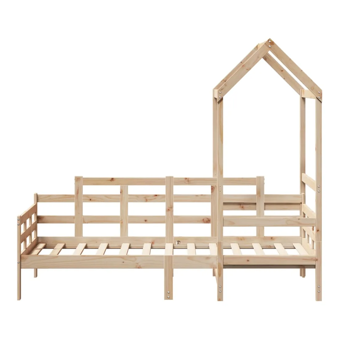 Ce lit de jour polyvalent en bois peut être utilisé comme un lit dans la chambre à coucher et est également idéal comme un canapé dans le salon. Il s'adapte parfaitement à vos différents besoins, vous offrant beaucoup d'espace pour dormir et vous reposer. Bois de pin massif : le bois de pin massif est un matériau naturel magnifique. Le bois de pin a un grain droit et les nœuds donnent au matériau son aspect caractéristique et rustique.Barres de lit sur 3 côtés : ce lit d'appoint présente un design unique sur le côté du lit, ce qui offre un sentiment de sécurité et ajoute une touche de style sophistiqué à votre intérieur.Design à lattes : le sommier à lattes en bois permet une meilleure circulation de l'air pour garder le matelas frais plus longtemps, améliorant la capacité de poids du lit et assurant la stabilité.Espace de rangement supplémentaire : profitez de l'espace sous le canapé pour ranger divers objets. Parfait pour ranger des boîtes pour organiser des vêtements, des jouets ou des couettes.Très amusant : en combinant le toit avec votre canapé-lit, vous pouvez créer une cachette qui permettra à votre enfant de s'amuser à l'heure du coucher. Cette addition innovante non seulement sera un point focal passionnant, mais aussi apportera de la fantaisie et de l'amusement dans la chambre.Porte latérale ouverte : le toit est doté d'une porte latérale ouverte qui permet à vos enfants d'entrer et de sortir facilement du lit. Bon à savoir :Un matelas n'est pas inclus avec ce lit. Nous offrons une sélection variée de matelas. Vous pouvez consulter notre boutique pour trouver un matelas assorti.