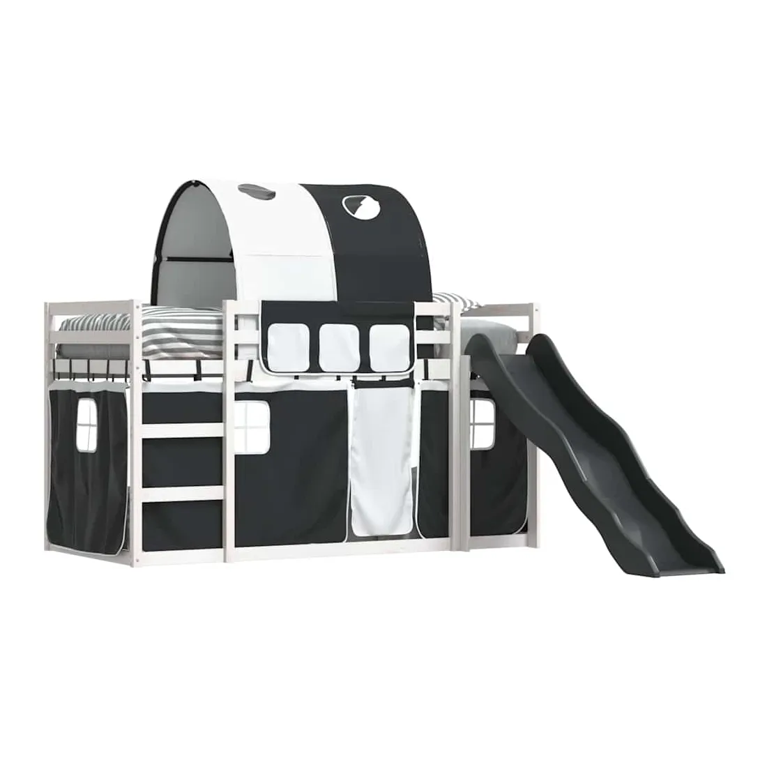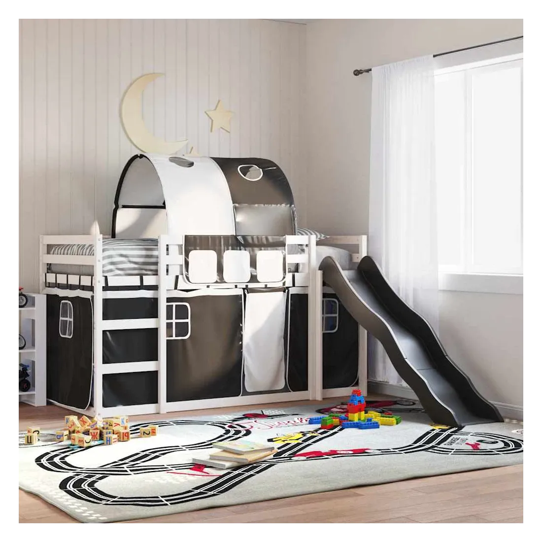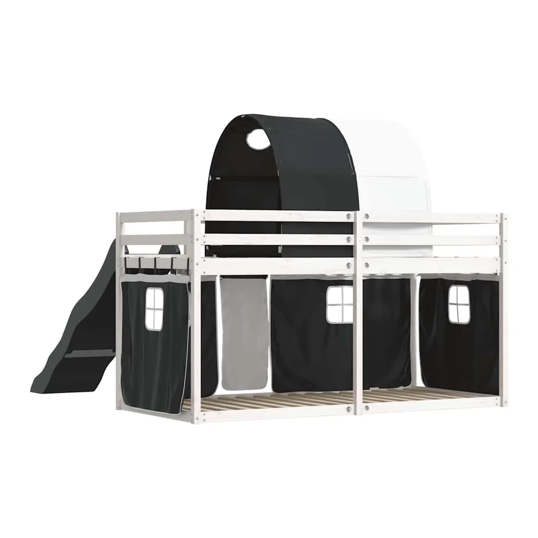 Ce lit superposé en bois est élégant et fonctionnel, ce qui en fait un supplément parfait à toute pièce dont l'espace est limité. Bois de pin massif : ce lit superposé est fabriqué en bois de pin massif pour plus de stabilité et de durabilité. Le bois de pin a un grain droit et les nœuds donnent au matériau son aspect rustique caractéristique.Très amusant : vous pouvez combiner les rideaux avec le lit superposé bas pour créer la base secrète de votre enfant, ce qui permet de s’amuser à l’heure du coucher et d’ajouter un point d'intérêt à la chambre à coucher !Barrières de sécurité : le lit supérieur est équipé de garde-corps de sécurité sur les 4 côtés, afin que votre enfant puisse dormir sans craindre de tomber.Échelle et toboggan pratiques : ce lit superposé est doté d'un toboggan amusant qui apporte de la joie et transforme leur chambre en une aire de jeux intérieure. La combinaison d'une échelle d'escalade et d'un toboggan rend l'heure du coucher plus vivante et plus intéressante pour les enfants.Lattes robustes : les lattes de contreplaqué assurent une bonne répartition du poids, garantissant que le matelas reste en place à chaque torsion de votre corps pendant le sommeil. Bon à savoir :Un matelas n'est pas inclus avec ce lit. Nous offrons une sélection variée de matelas. Vous pouvez consulter notre boutique pour trouver un matelas assorti. Attention :Pour éviter qu'il ne bascule, ce produit doit être utilisé avec le dispositif de fixation murale fourni.