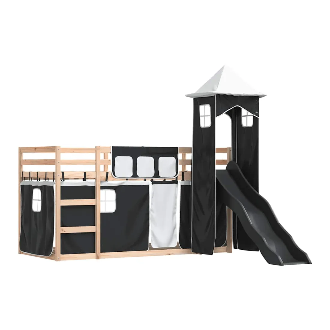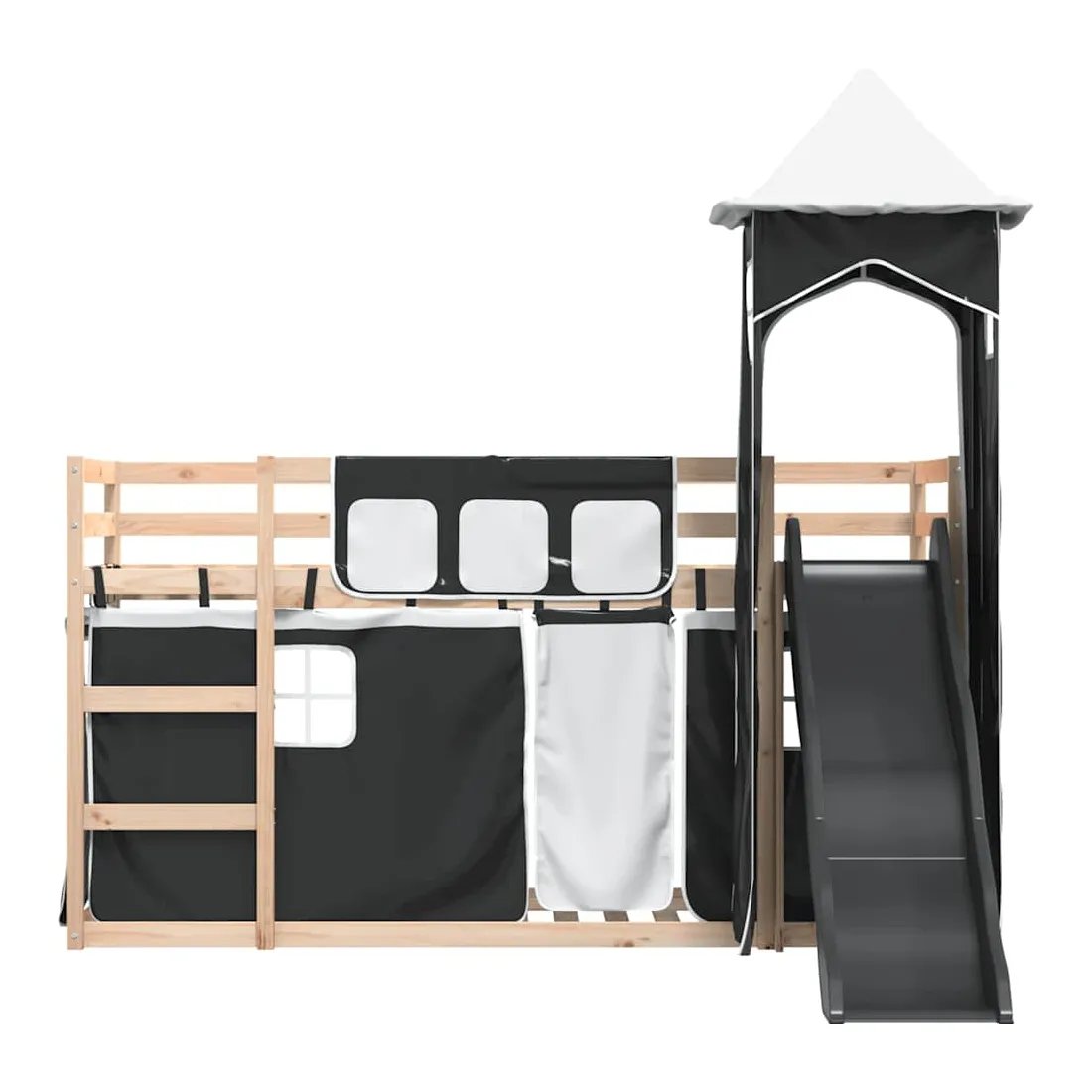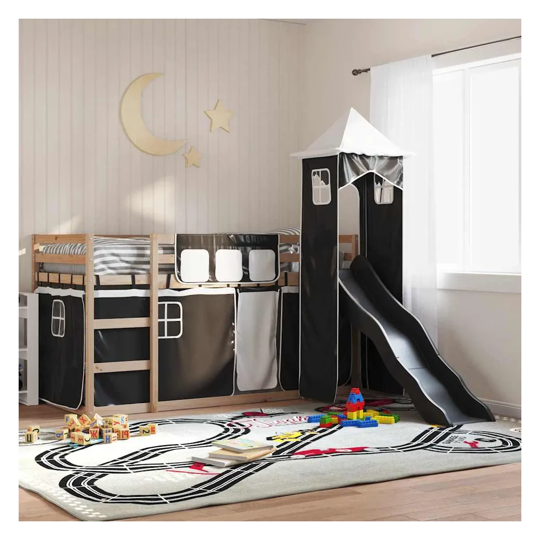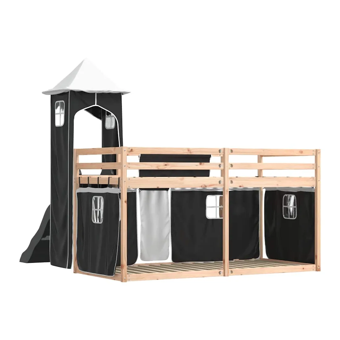 Ce lit superposé en bois est élégant et fonctionnel, ce qui en fait un supplément parfait à toute pièce dont l'espace est limité. Bois de pin massif : ce lit superposé est fabriqué en bois de pin massif pour plus de stabilité et de durabilité. Le bois de pin a un grain droit et les nœuds donnent au matériau son aspect rustique caractéristique.Très amusant : vous pouvez combiner les rideaux avec le lit superposé bas pour créer la base secrète de votre enfant, ce qui permet de s’amuser à l’heure du coucher et d’ajouter un point d'intérêt à la chambre à coucher !Barrières de sécurité : le lit supérieur est équipé de garde-corps de sécurité sur les 4 côtés, afin que votre enfant puisse dormir sans craindre de tomber.Échelle et toboggan pratiques : ce lit superposé est doté d'un toboggan amusant qui apporte de la joie et transforme leur chambre en une aire de jeux intérieure. La combinaison d'une échelle d'escalade et d'un toboggan rend l'heure du coucher plus vivante et plus intéressante pour les enfants.Lattes robustes : les lattes de contreplaqué assurent une bonne répartition du poids, garantissant que le matelas reste en place à chaque torsion de votre corps pendant le sommeil. Bon à savoir :Un matelas n'est pas inclus avec ce lit. Nous offrons une sélection variée de matelas. Vous pouvez consulter notre boutique pour trouver un matelas assorti. Attention :Pour éviter qu'il ne bascule, ce produit doit être utilisé avec le dispositif de fixation murale fourni.