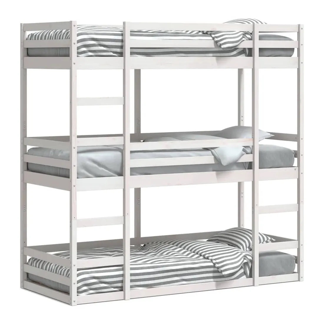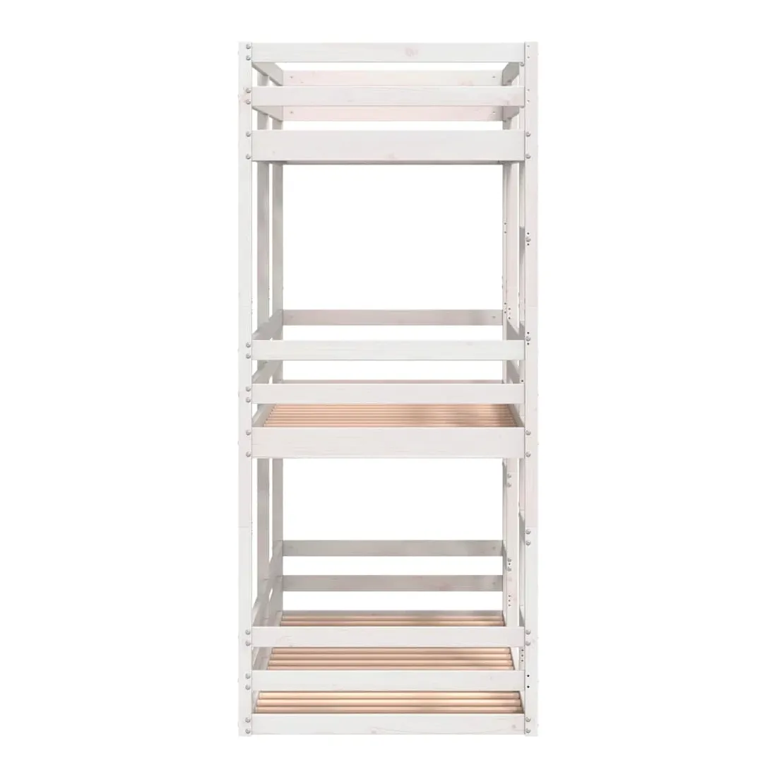 Ce lit superposé triple en bois est élégant et fonctionnel, ce qui en fait un supplément parfait à toute pièce dont l'espace est limité. Robuste et stable : le bois de pin massif est connu pour sa résistance et sa durabilité. Ses grains droits et ses nœuds distinctifs contribuent à son charme rustique.Barrières de sécurité : le lit triple est équipé de garde-corps de sécurité sur les 4 côtés, afin que vous puissiez dormir sans craindre de tomber.Échelle pratique : l'échelle de ce lit superposé facilite et sécurise le sommeil à l'étage supérieur et offre une sécurité et une stabilité suffisantes.Utilisation optimale de l'espace : ce lit superposé triple utilise efficacement l'espace vertical et peut être facilement transformé en lits simples et en lits à plate-forme séparés. Ce lit triple est parfait pour les familles à plusieurs enfants ou pour les invités de passage, car il répond à des besoins de couchage très variés. Bon à savoir :La livraison comprend uniquement les cadres de lit. Les matelas ne sont pas inclus. Vous pouvez consulter notre boutique pour trouver les matelas assortis.Les vis et les chevilles pour l'intérieur du mur ne sont pas incluses. Nous vous conseillons de trouver et d'utiliser des vis et des chevilles adaptées spécifiquement à vos murs. Si vous n'êtes pas sûr, vous pouvez consulter un professionnel. Veuillez lire et suivre chaque étape des instructions.