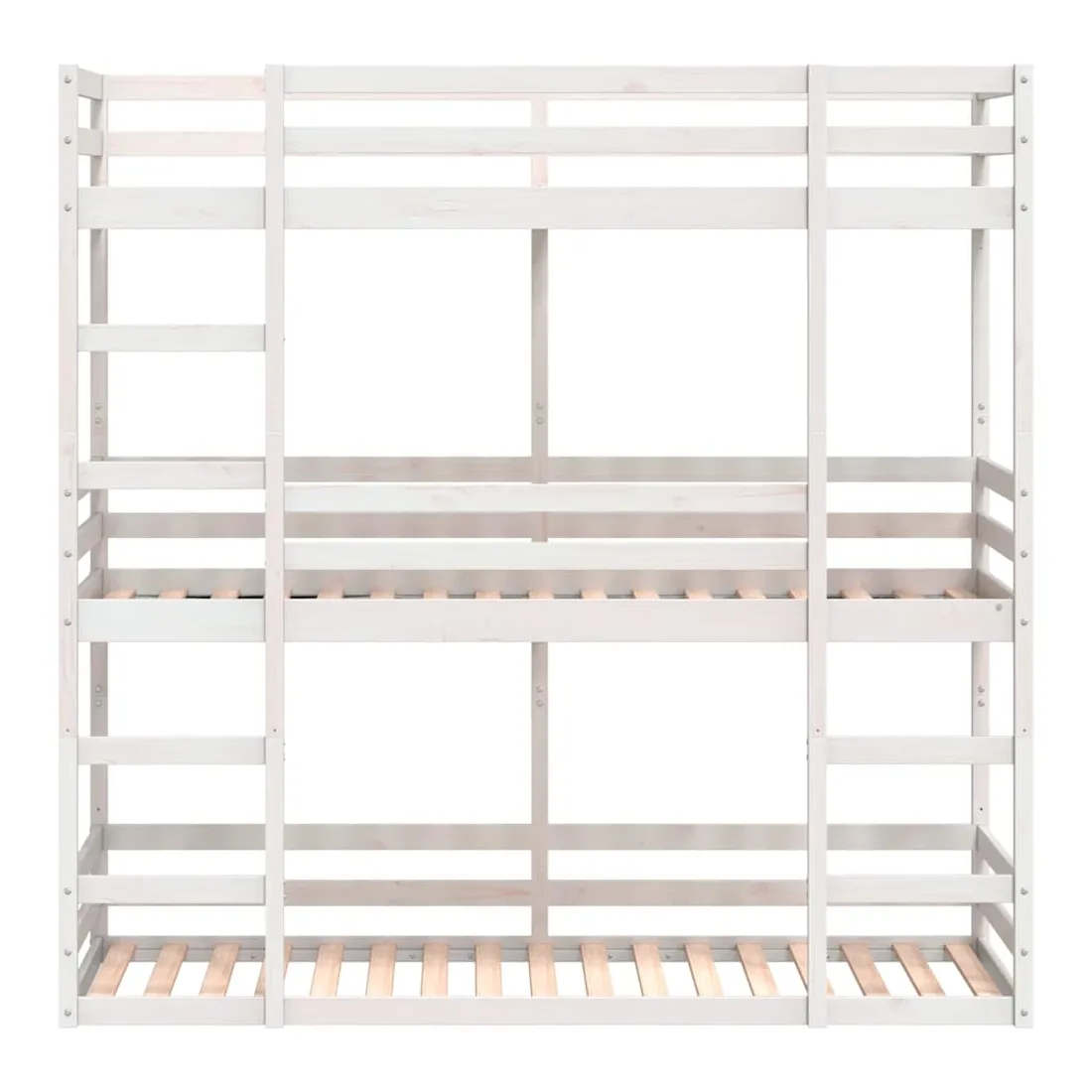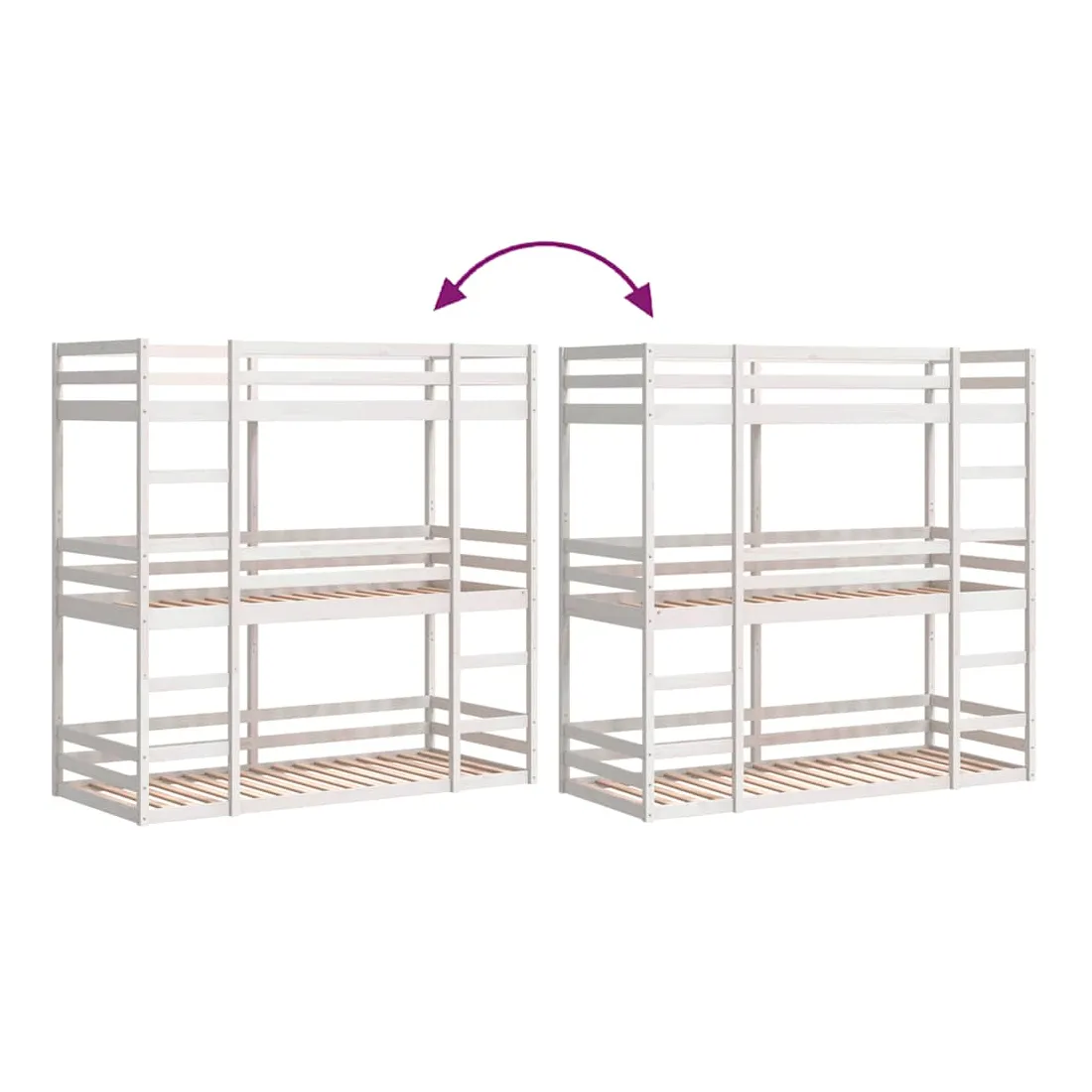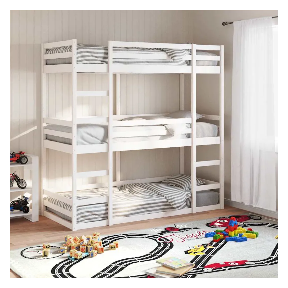 Ce lit superposé triple en bois est élégant et fonctionnel, ce qui en fait un supplément parfait à toute pièce dont l'espace est limité. Robuste et stable : le bois de pin massif est connu pour sa résistance et sa durabilité. Ses grains droits et ses nœuds distinctifs contribuent à son charme rustique.Barrières de sécurité : le lit triple est équipé de garde-corps de sécurité sur les 4 côtés, afin que vous puissiez dormir sans craindre de tomber.Échelle pratique : l'échelle de ce lit superposé facilite et sécurise le sommeil à l'étage supérieur et offre une sécurité et une stabilité suffisantes.Utilisation optimale de l'espace : ce lit superposé triple utilise efficacement l'espace vertical et peut être facilement transformé en lits simples et en lits à plate-forme séparés. Ce lit triple est parfait pour les familles à plusieurs enfants ou pour les invités de passage, car il répond à des besoins de couchage très variés. Bon à savoir :La livraison comprend uniquement les cadres de lit. Les matelas ne sont pas inclus. Vous pouvez consulter notre boutique pour trouver les matelas assortis.Les vis et les chevilles pour l'intérieur du mur ne sont pas incluses. Nous vous conseillons de trouver et d'utiliser des vis et des chevilles adaptées spécifiquement à vos murs. Si vous n'êtes pas sûr, vous pouvez consulter un professionnel. Veuillez lire et suivre chaque étape des instructions.