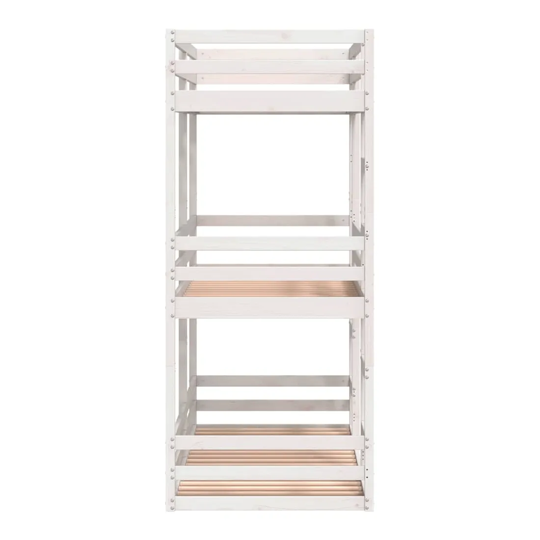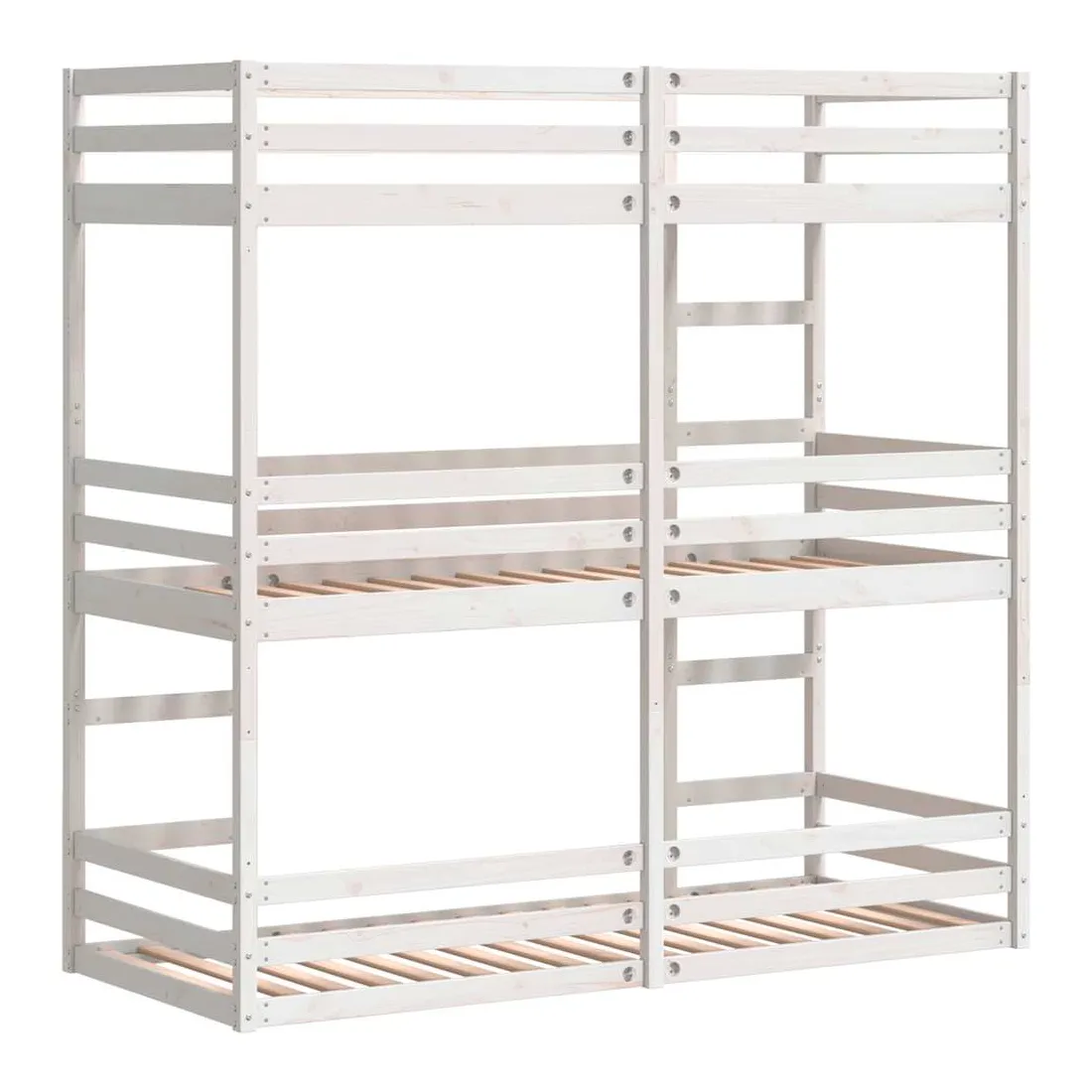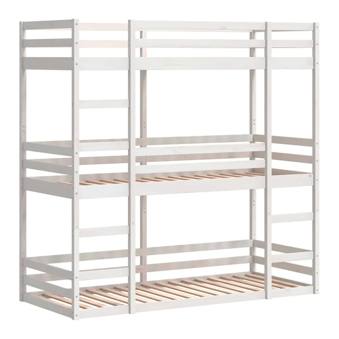 Ce lit superposé triple en bois est élégant et fonctionnel, ce qui en fait un supplément parfait à toute pièce dont l'espace est limité. Robuste et stable : le bois de pin massif est connu pour sa résistance et sa durabilité. Ses grains droits et ses nœuds distinctifs contribuent à son charme rustique.Barrières de sécurité : le lit triple est équipé de garde-corps de sécurité sur les 4 côtés, afin que vous puissiez dormir sans craindre de tomber.Échelle pratique : l'échelle de ce lit superposé facilite et sécurise le sommeil à l'étage supérieur et offre une sécurité et une stabilité suffisantes.Utilisation optimale de l'espace : ce lit superposé triple utilise efficacement l'espace vertical et peut être facilement transformé en lits simples et en lits à plate-forme séparés. Ce lit triple est parfait pour les familles à plusieurs enfants ou pour les invités de passage, car il répond à des besoins de couchage très variés. Bon à savoir :La livraison comprend uniquement les cadres de lit. Les matelas ne sont pas inclus. Vous pouvez consulter notre boutique pour trouver les matelas assortis.Les vis et les chevilles pour l'intérieur du mur ne sont pas incluses. Nous vous conseillons de trouver et d'utiliser des vis et des chevilles adaptées spécifiquement à vos murs. Si vous n'êtes pas sûr, vous pouvez consulter un professionnel. Veuillez lire et suivre chaque étape des instructions.