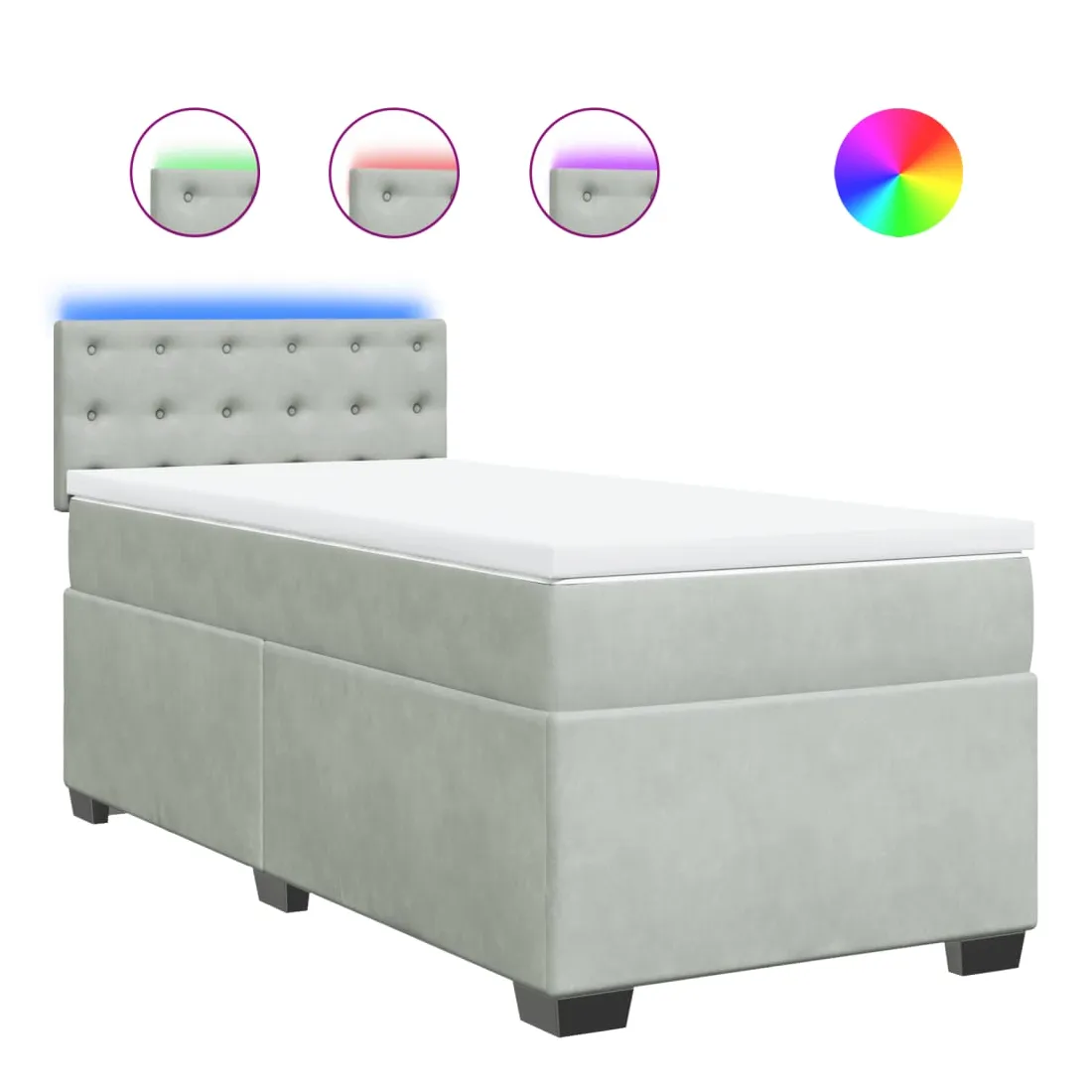 Utilisez ce lit à sommier pour profiter d'une nuit de sommeil réparatrice ! Il vous offre une relaxation maximale et un sommeil agréable. Matériau doux et confortable : le tissu en velours présente une surface douce et lisse qui offre une sensation agréable contre la peau, vous apportant chaleur et confort ultime.Matelas à ressorts ensachés : ce matelas à ressorts ensachés comporte des ressorts ensachés individuels qui fonctionnent indépendamment pour offrir un soutien personnalisé en réagissant uniquement à la pression exercée dans chaque zone. Cette conception empêche « l'enroulement » et réduit le transfert de mouvement par rapport aux matelas traditionnels à ressorts ouverts. Chaque ressort ensaché soutient le corps individuellement.Lumières LED pour une ambiance agréable : ce lit est équipé de lumières LED qui peuvent être facilement réglées pour créer un spectacle lumineux personnalisé. Vous pouvez personnaliser les modes, les couleurs et la luminosité pour améliorer l'ambiance de votre espace intérieur.Surmatelas confortable : ce surmatelas améliore le soutien et le confort grâce à sa surface douce et respirante, tout en prolongeant la durée de vie de votre matelas. Sa housse amovible permet un lavage facile, ce qui facilite l'entretien. Bon à savoir :Ce produit est doté d'un connecteur USB qui nécessite une source d'alimentation USB de 5V certifiée (non incluse).Pour des raisons d'hygiène, le matelas ne peut pas être retourné si l'emballage est retiré ou ouvert.Seule la partie avec un symbole de ciseaux peut être coupée et seule la partie avec l'USB continuera à fonctionner comme avant.