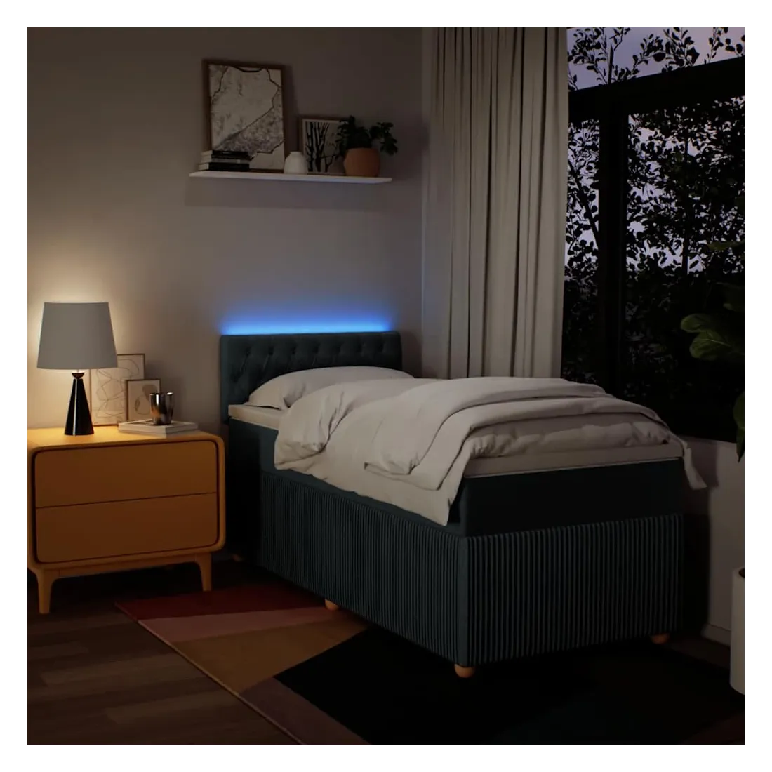 Utilisez ce lit à sommier pour profiter d'une nuit de sommeil réparatrice ! Il vous offre une relaxation maximale et un sommeil agréable. Matériau doux et durable : le tissu en polyester allie douceur, respirabilité et durabilité, vous garantissant un confort et une convivialité ultimes.Matelas à ressorts ensachés : ce matelas à ressorts ensachés comporte des ressorts ensachés individuels qui fonctionnent indépendamment pour offrir un soutien personnalisé en réagissant uniquement à la pression exercée dans chaque zone. Cette conception empêche « l'enroulement » et réduit le transfert de mouvement par rapport aux matelas traditionnels à ressorts ouverts. Chaque ressort ensaché soutient le corps individuellement.Lumières LED pour une ambiance agréable : ce lit est équipé de lumières LED qui peuvent être facilement réglées pour créer un spectacle lumineux personnalisé. Vous pouvez personnaliser les modes, les couleurs et la luminosité pour améliorer l'ambiance de votre espace intérieur.Surmatelas confortable : ce surmatelas améliore le soutien et le confort grâce à sa surface douce et respirante, tout en prolongeant la durée de vie de votre matelas. Sa housse amovible permet un lavage facile, ce qui facilite l'entretien. Bon à savoir :Ce produit est doté d'un connecteur USB qui nécessite une source d'alimentation USB de 5V certifiée (non incluse).Pour des raisons d'hygiène, le matelas ne peut pas être retourné si l'emballage est retiré ou ouvert.Seule la partie avec un symbole de ciseaux peut être coupée et seule la partie avec l'USB continuera à fonctionner comme avant.