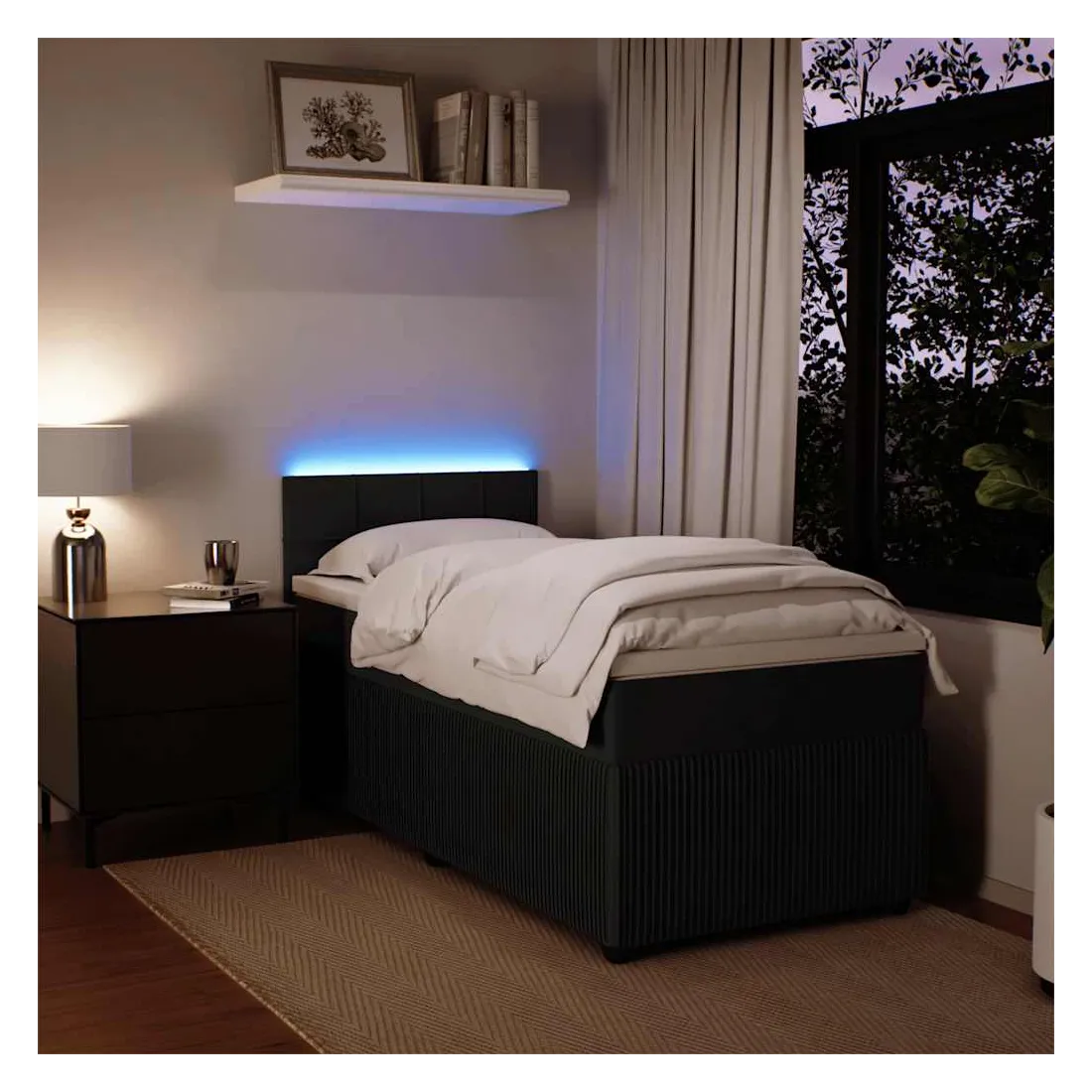 Utilisez ce lit à sommier pour profiter d'une nuit de sommeil réparatrice ! Il vous offre une relaxation maximale et un sommeil agréable. Matériau doux et confortable : le tissu en velours présente une surface douce et lisse qui offre une sensation agréable contre la peau, vous apportant chaleur et confort ultime.Matelas à ressorts ensachés : ce matelas à ressorts ensachés comporte des ressorts ensachés individuels qui fonctionnent indépendamment pour offrir un soutien personnalisé en réagissant uniquement à la pression exercée dans chaque zone. Cette conception empêche « l'enroulement » et réduit le transfert de mouvement par rapport aux matelas traditionnels à ressorts ouverts. Chaque ressort ensaché soutient le corps individuellement.Lumières LED pour une ambiance agréable : ce lit est équipé de lumières LED qui peuvent être facilement réglées pour créer un spectacle lumineux personnalisé. Vous pouvez personnaliser les modes, les couleurs et la luminosité pour améliorer l'ambiance de votre espace intérieur.Surmatelas confortable : ce surmatelas améliore le soutien et le confort grâce à sa surface douce et respirante, tout en prolongeant la durée de vie de votre matelas. Sa housse amovible permet un lavage facile, ce qui facilite l'entretien. Bon à savoir :Ce produit est doté d'un connecteur USB qui nécessite une source d'alimentation USB de 5V certifiée (non incluse).Pour des raisons d'hygiène, le matelas ne peut pas être retourné si l'emballage est retiré ou ouvert.Seule la partie avec un symbole de ciseaux peut être coupée et seule la partie avec l'USB continuera à fonctionner comme avant.