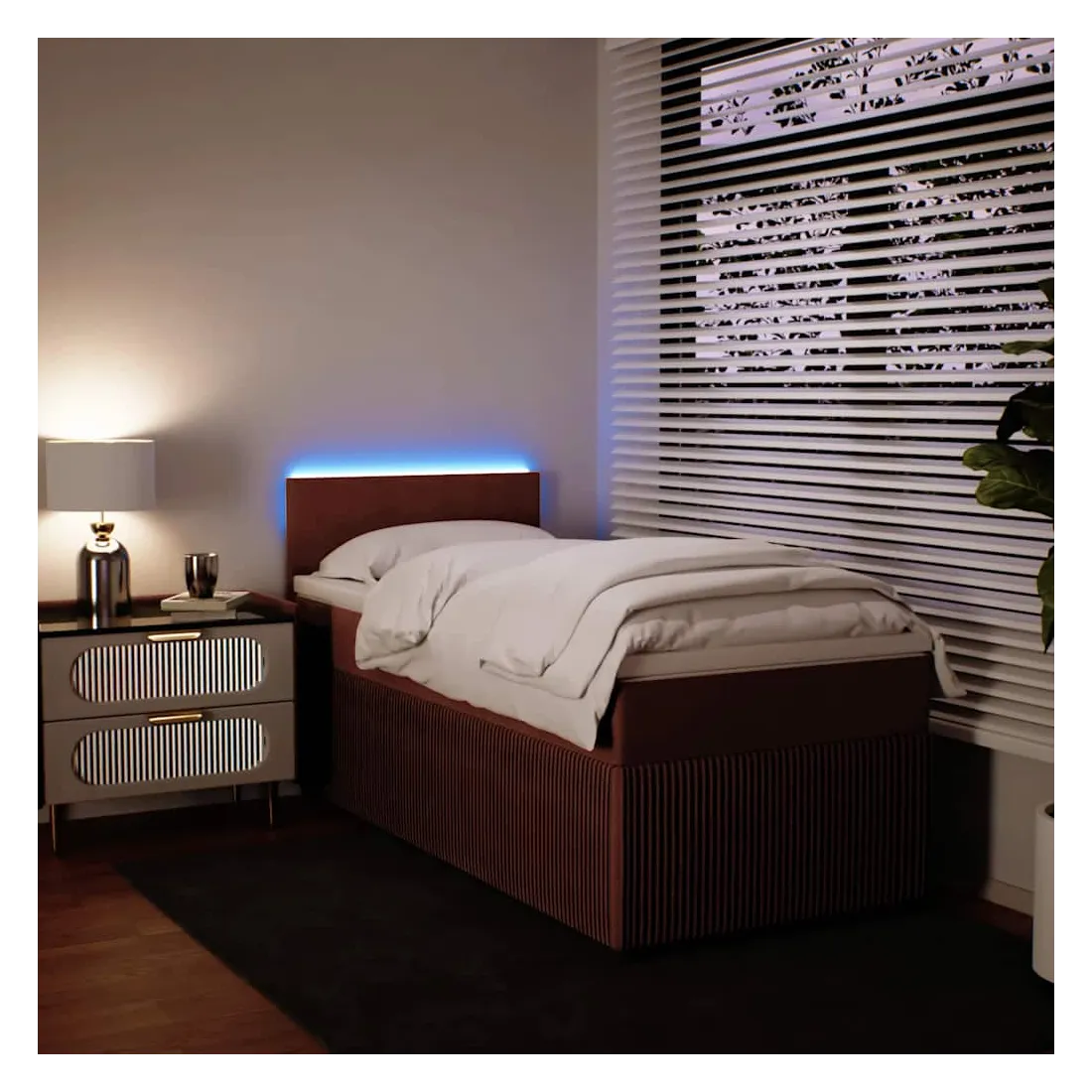 Utilisez ce lit à sommier pour profiter d'une nuit de sommeil réparatrice ! Il vous offre une relaxation maximale et un sommeil agréable. Matériau doux et confortable : le tissu en velours présente une surface douce et lisse qui offre une sensation agréable contre la peau, vous apportant chaleur et confort ultime.Matelas à ressorts ensachés : ce matelas à ressorts ensachés comporte des ressorts ensachés individuels qui fonctionnent indépendamment pour offrir un soutien personnalisé en réagissant uniquement à la pression exercée dans chaque zone. Cette conception empêche « l'enroulement » et réduit le transfert de mouvement par rapport aux matelas traditionnels à ressorts ouverts. Chaque ressort ensaché soutient le corps individuellement.Lumières LED pour une ambiance agréable : ce lit est équipé de lumières LED qui peuvent être facilement réglées pour créer un spectacle lumineux personnalisé. Vous pouvez personnaliser les modes, les couleurs et la luminosité pour améliorer l'ambiance de votre espace intérieur.Surmatelas confortable : ce surmatelas améliore le soutien et le confort grâce à sa surface douce et respirante, tout en prolongeant la durée de vie de votre matelas. Sa housse amovible permet un lavage facile, ce qui facilite l'entretien. Bon à savoir :Ce produit est doté d'un connecteur USB qui nécessite une source d'alimentation USB de 5V certifiée (non incluse).Pour des raisons d'hygiène, le matelas ne peut pas être retourné si l'emballage est retiré ou ouvert.Seule la partie avec un symbole de ciseaux peut être coupée et seule la partie avec l'USB continuera à fonctionner comme avant.