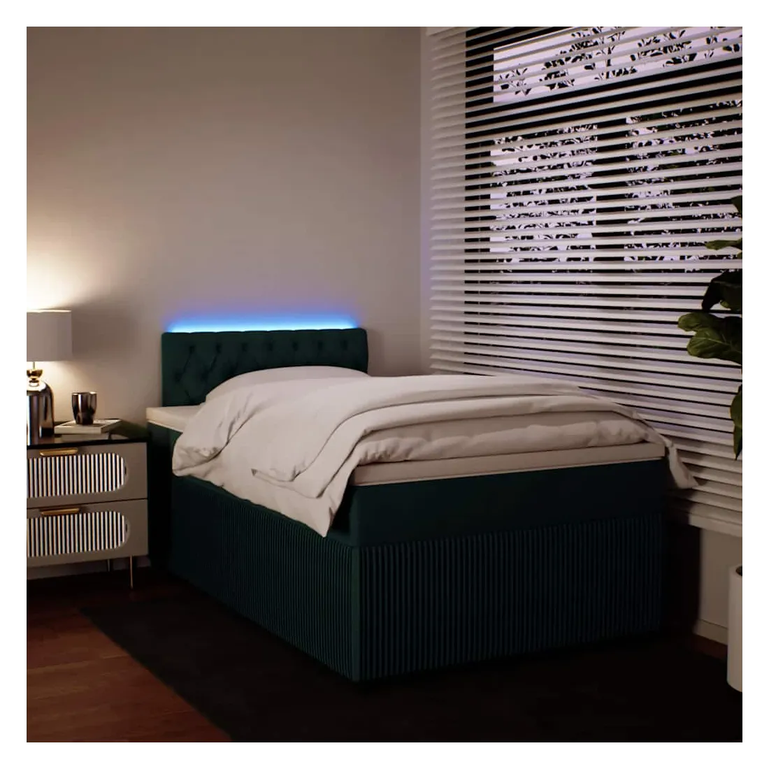 Utilisez ce lit à sommier pour profiter d'une nuit de sommeil réparatrice ! Il vous offre une relaxation maximale et un sommeil agréable. Matériau doux et confortable : le tissu en velours présente une surface douce et lisse qui offre une sensation agréable contre la peau, vous apportant chaleur et confort ultime.Matelas à ressorts ensachés : ce matelas à ressorts ensachés comporte des ressorts ensachés individuels qui fonctionnent indépendamment pour offrir un soutien personnalisé en réagissant uniquement à la pression exercée dans chaque zone. Cette conception empêche « l'enroulement » et réduit le transfert de mouvement par rapport aux matelas traditionnels à ressorts ouverts. Chaque ressort ensaché soutient le corps individuellement.Lumières LED pour une ambiance agréable : ce lit est équipé de lumières LED qui peuvent être facilement réglées pour créer un spectacle lumineux personnalisé. Vous pouvez personnaliser les modes, les couleurs et la luminosité pour améliorer l'ambiance de votre espace intérieur.Surmatelas confortable : ce surmatelas améliore le soutien et le confort grâce à sa surface douce et respirante, tout en prolongeant la durée de vie de votre matelas. Sa housse amovible permet un lavage facile, ce qui facilite l'entretien. Bon à savoir :Ce produit est doté d'un connecteur USB qui nécessite une source d'alimentation USB de 5V certifiée (non incluse).Pour des raisons d'hygiène, le matelas ne peut pas être retourné si l'emballage est retiré ou ouvert.Seule la partie avec un symbole de ciseaux peut être coupée et seule la partie avec l'USB continuera à fonctionner comme avant.