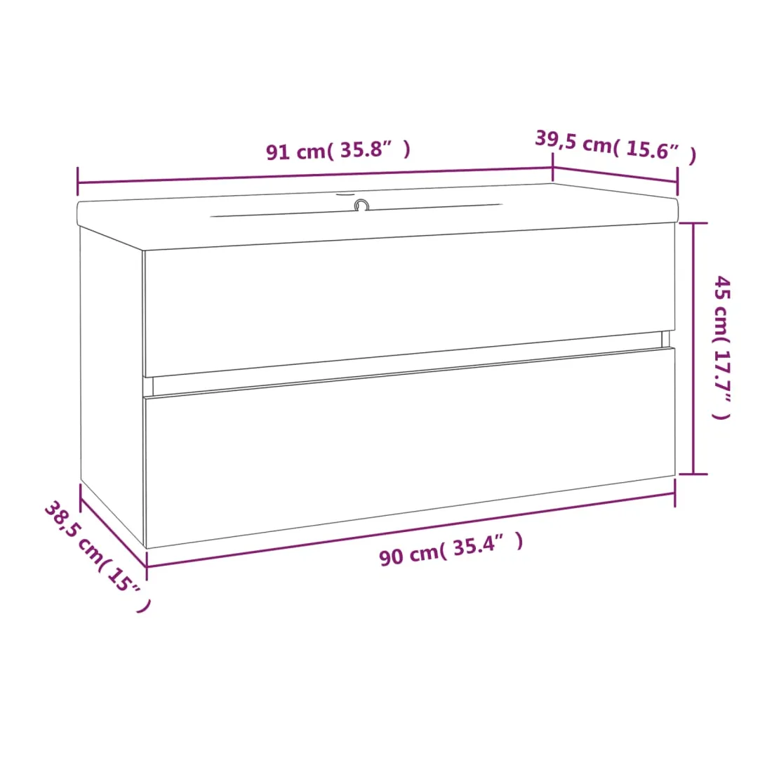 Cet élégant meuble-lavabo avec bassin intégré, avec un espace de rangement spacieux, est un excellent supplément à votre salle de bain, ce qui lui donne une apparence ordonnée et saisissante ! Matériau robuste : le meuble sous évier est fabriqué en bois d'ingénierie, qui est d'une qualité exceptionnelle avec une surface lisse et se caractérise également par sa solidité, stabilité et résistance à l'humidité.Grand espace de rangement : le meuble lavabo de salle de bain dispose d'un tiroir, offrant un grand espace de rangement pour ranger des articles dans votre salle de bain.Design pratique : le dessus de ce meuble de salle de bain est idéal pour placer le lavabo.Fonction murale : l'armoire de salle de bain peut être fixée au mur pour ajouter de l'espace de stockage supplémentaire. De cette façon, vous pouvez maximiser votre espace au sol et garder la zone propre.Fonction de trop-plein : un trop-plein est également équipé pour vidanger l'eau lorsqu'il est trop plein. Remarque :Les vis et les chevilles pour l'intérieur du mur ne sont pas incluses. Recherchez et utilisez des vis et des chevilles adaptées à vos murs. Si vous n'êtes pas sûr, demandez conseil à un professionnel. Lisez et suivez attentivement chaque étape des instructions.Le robinet et le vidange ne sont pas inclus dans la livraison.Chaque produit est livré avec un manuel de montage dans la boîte pour un montage facile.