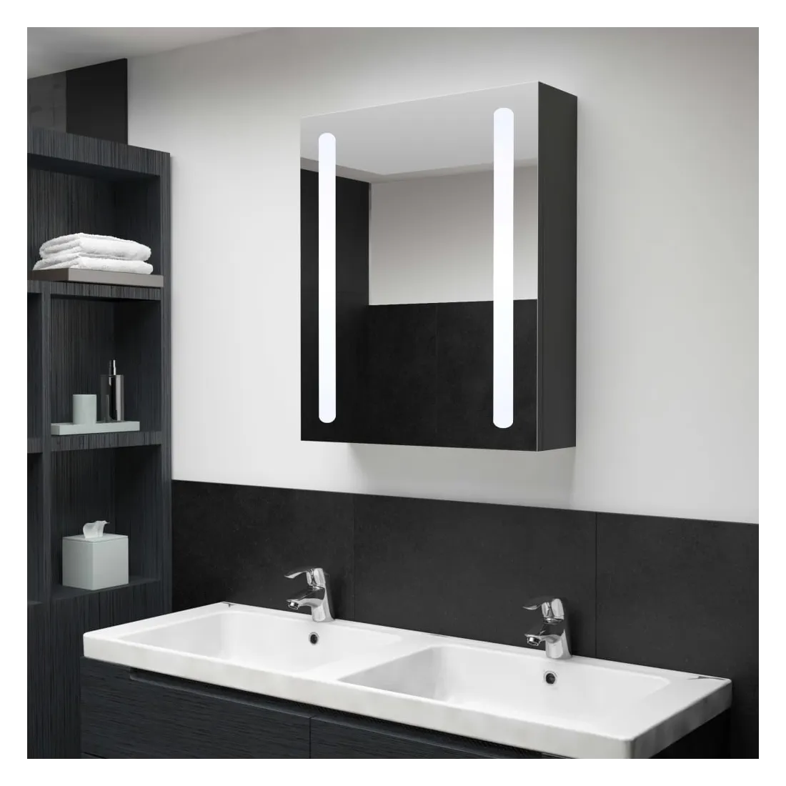 Introduisez une esthétique agréable dans votre salle de bain avec cette armoire de toilette ! L'armoire de toilette à miroir avec LED ajoute une touche de style contemporain et une lumière douce et éclairante à toute pièce ! Elle est faite de panneaux MDF de qualité avec une finition mélaminée, garantissant une utilisation à long terme. Grâce aux deux bandes lumineuses à LED écoénergétiques, vous pouvez vous voir sous la lumière la plus pure pour le maquillage, les soins de la peau et les soins de la peau. Elle illumine votre chambre, votre visage et votre sourire. À l’intérieur, vous trouverez 3 tablettes offrant un espace de rangement suffisant pour tous vos articles de toilette et accessoires de beauté. Vous pouvez facilement allumer/éteindre la lumière avec le bouton du bas. Élégante et fonctionnelle, cette armoire fera sûrement la décoration de votre pièce originale et exceptionnelle ! Remarque : ce produit est doté d'un connecteur USB, mais la source d'alimentation certifiée de USB 5V n'est pas incluse.