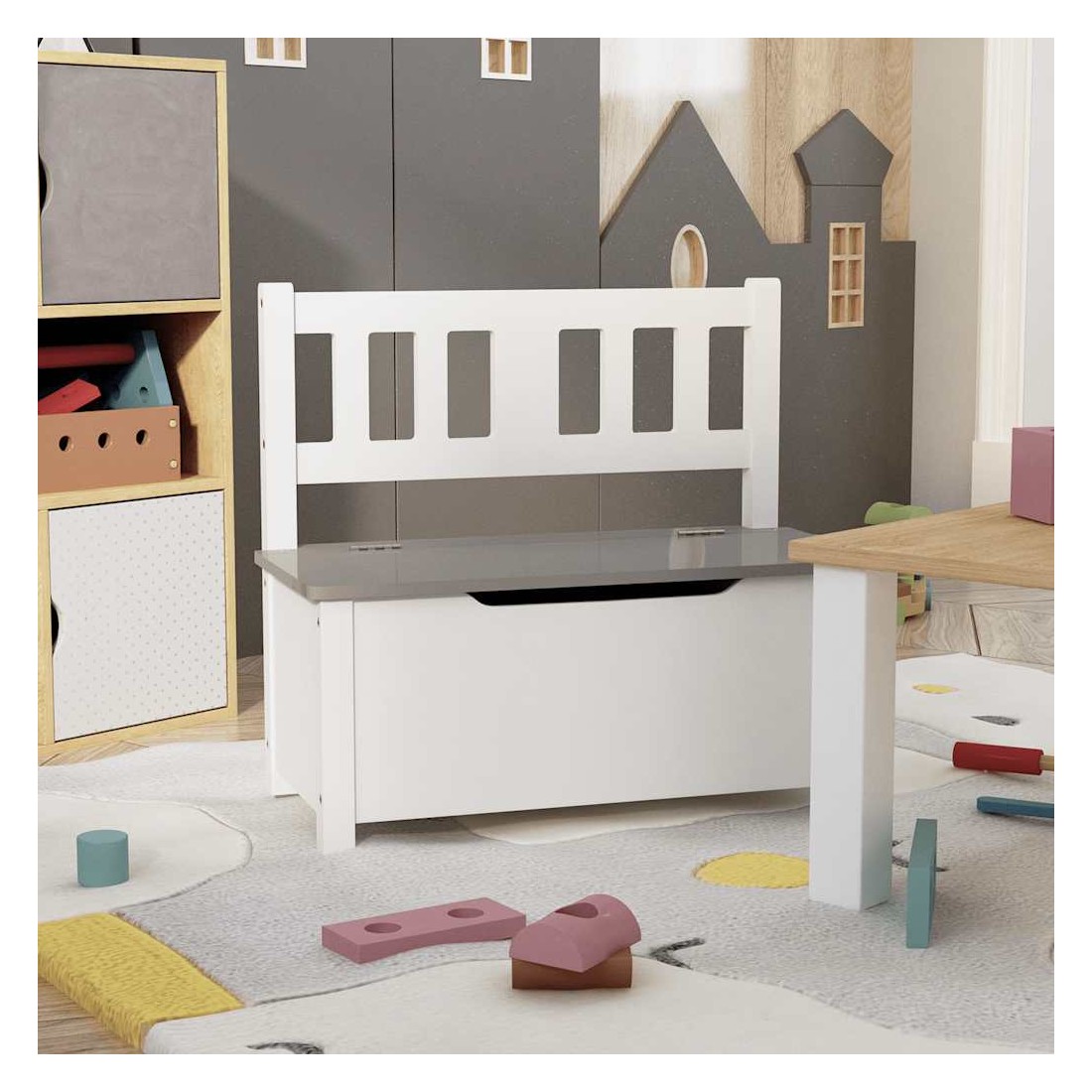 Ce banc de rangement offre à votre enfant une place d'assise confortable ainsi qu'un coffre de rangement parfait. Ce banc en forme de coffre est fabriqué en MDF, ce qui le rend durable. Il a une combinaison parfaite d'assise et d'espace de stockage. Le coffre de rangement intégré avec couvercle est idéal pour bien ranger les jouets et autres objets. Ce banc en forme de boîte est un véritable accroche-regard dans la chambre des enfants. GPSR
