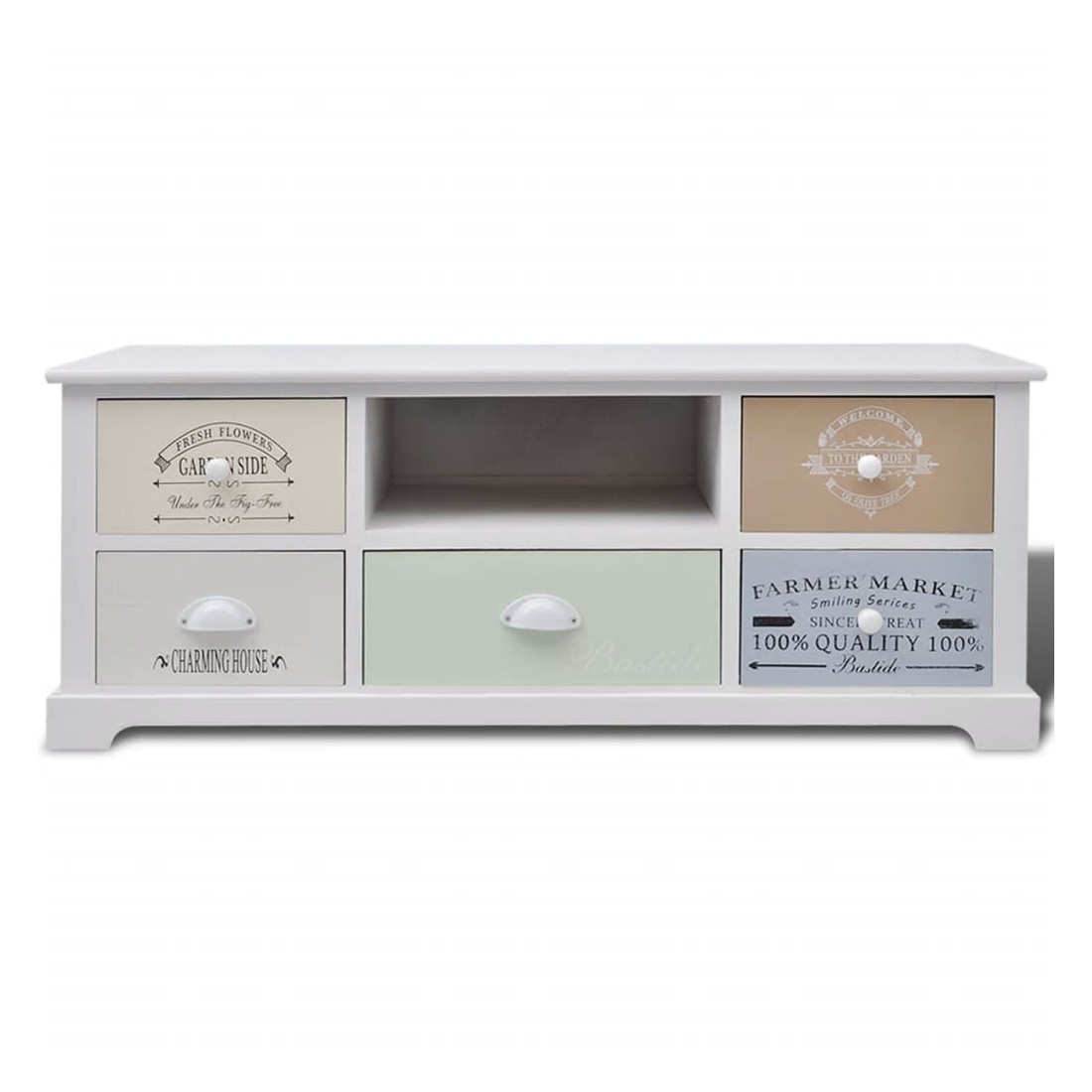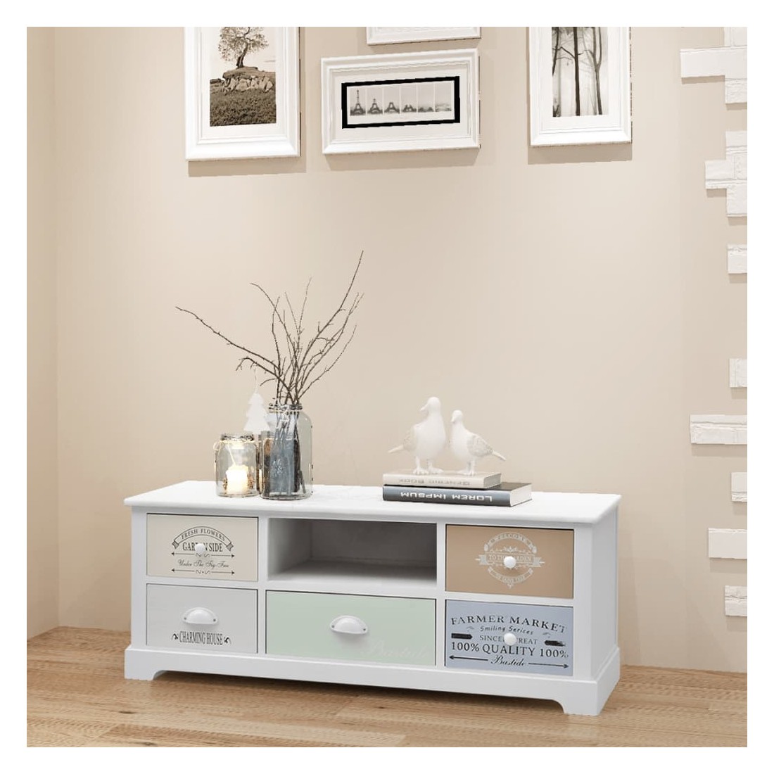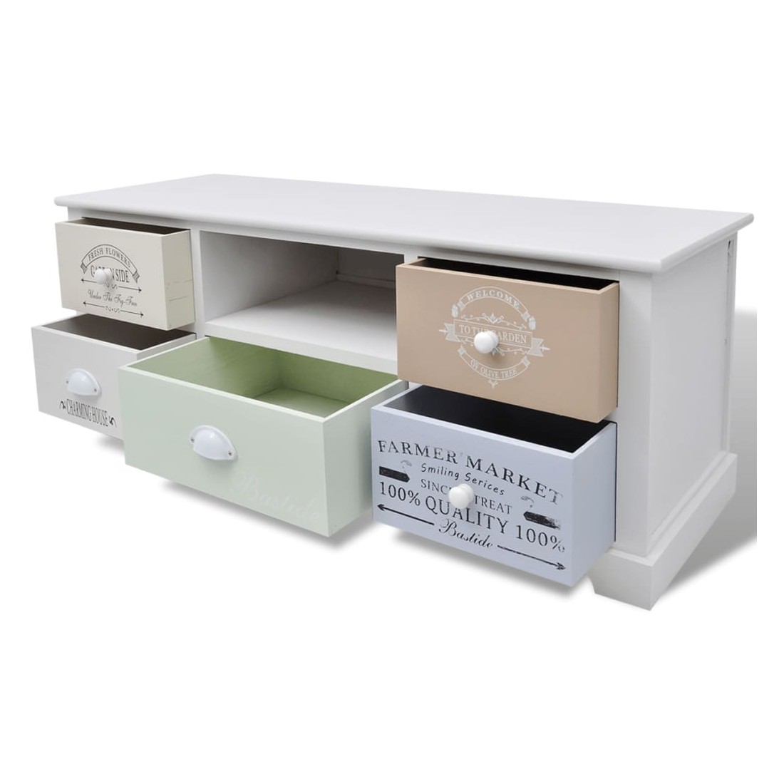 Ajoutez une touche de charme rustique à votre maison avec ce meuble TV /support hi-fi chic en style français classique ! Ce meuble en style d'époque est doté de 5 tiroirs coulissants qui fournissent amplement d'espace de rangement pour vos effets personnels et gardent votre chambre organisée. Le tiroir médian est peint en vert clair élégant. Les 4 tiroirs latéraux, avec des gravures en style d'époque, ajoutent du charme rustique au meuble. Les tiroirs latéraux sont échangeables. En dessous du tiroir médian il y a un compartiment spacieux où vous pouvez garder des articles tels que des appareils multimédia, des livres, des revues et d'autres articles que vous voulez tenir à portée de main. Fabriqué en matériaux de haute qualité, ce meuble est durable et facile à nettoyer.