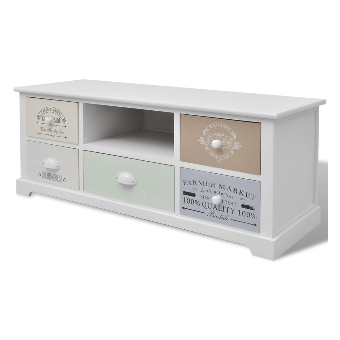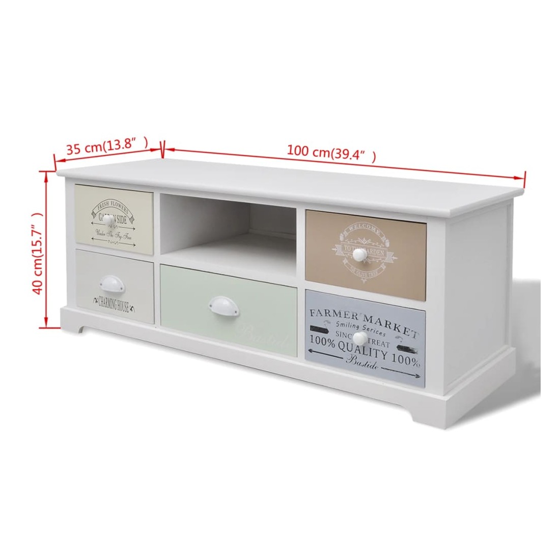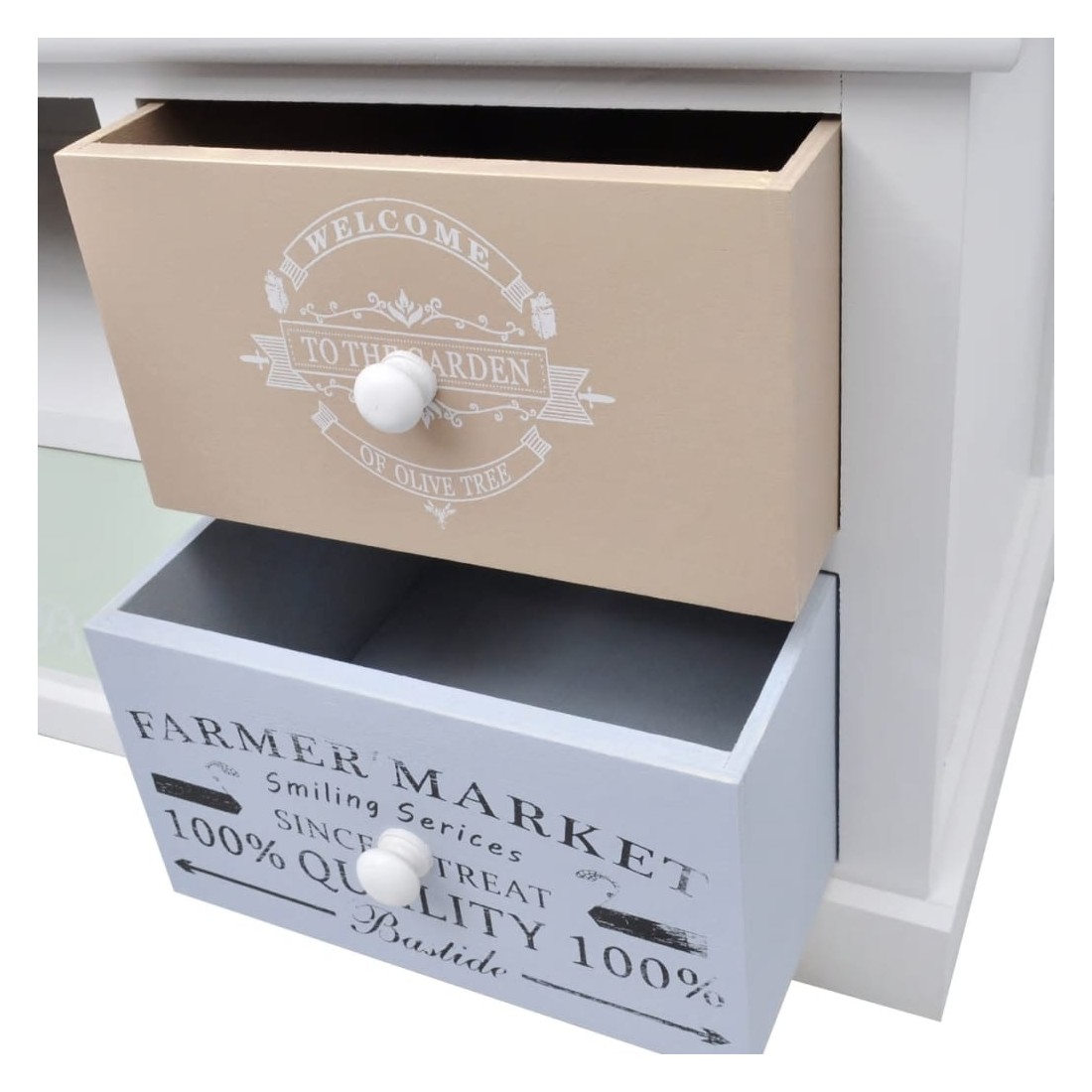 Ajoutez une touche de charme rustique à votre maison avec ce meuble TV /support hi-fi chic en style français classique ! Ce meuble en style d'époque est doté de 5 tiroirs coulissants qui fournissent amplement d'espace de rangement pour vos effets personnels et gardent votre chambre organisée. Le tiroir médian est peint en vert clair élégant. Les 4 tiroirs latéraux, avec des gravures en style d'époque, ajoutent du charme rustique au meuble. Les tiroirs latéraux sont échangeables. En dessous du tiroir médian il y a un compartiment spacieux où vous pouvez garder des articles tels que des appareils multimédia, des livres, des revues et d'autres articles que vous voulez tenir à portée de main. Fabriqué en matériaux de haute qualité, ce meuble est durable et facile à nettoyer.
