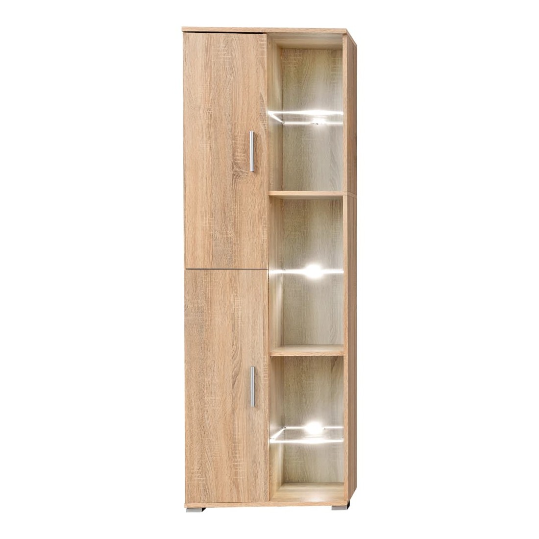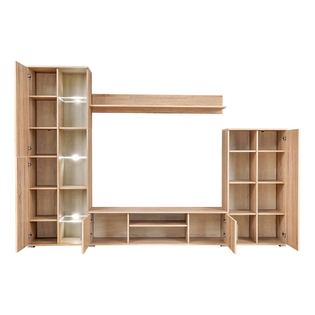 Cette unité murale s'intégrera parfaitement dans votre salon en optimisant votre espace sans compromettre le style. L'unité murale, composée de deux armoires latérales de tailles différentes, d'un meuble TV et d'une étagère de présentation, offre suffisamment d'espace pour ranger vos appareils multimédia, lecteur DVD, supports multimédia, livres et toutes sortes de petits objets. Elle sera également idéale pour exposer des objets décoratifs, des cadres photo ou même des plantes en pot. L'armoire de gauche comporte trois étagères en verre avec un éclairage LED blanc à faible consommation d'énergie pour créer une atmosphère séduisante. Notre vitrine murale est faite de bois d'ingénierie de haute qualité et a des poignées et des pieds en métal, ce qui lui donne un aspect contemporain qui s'adapte à tous les décors. L'assemblage est facile.