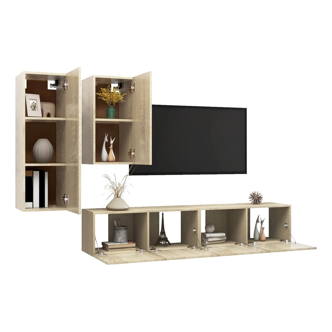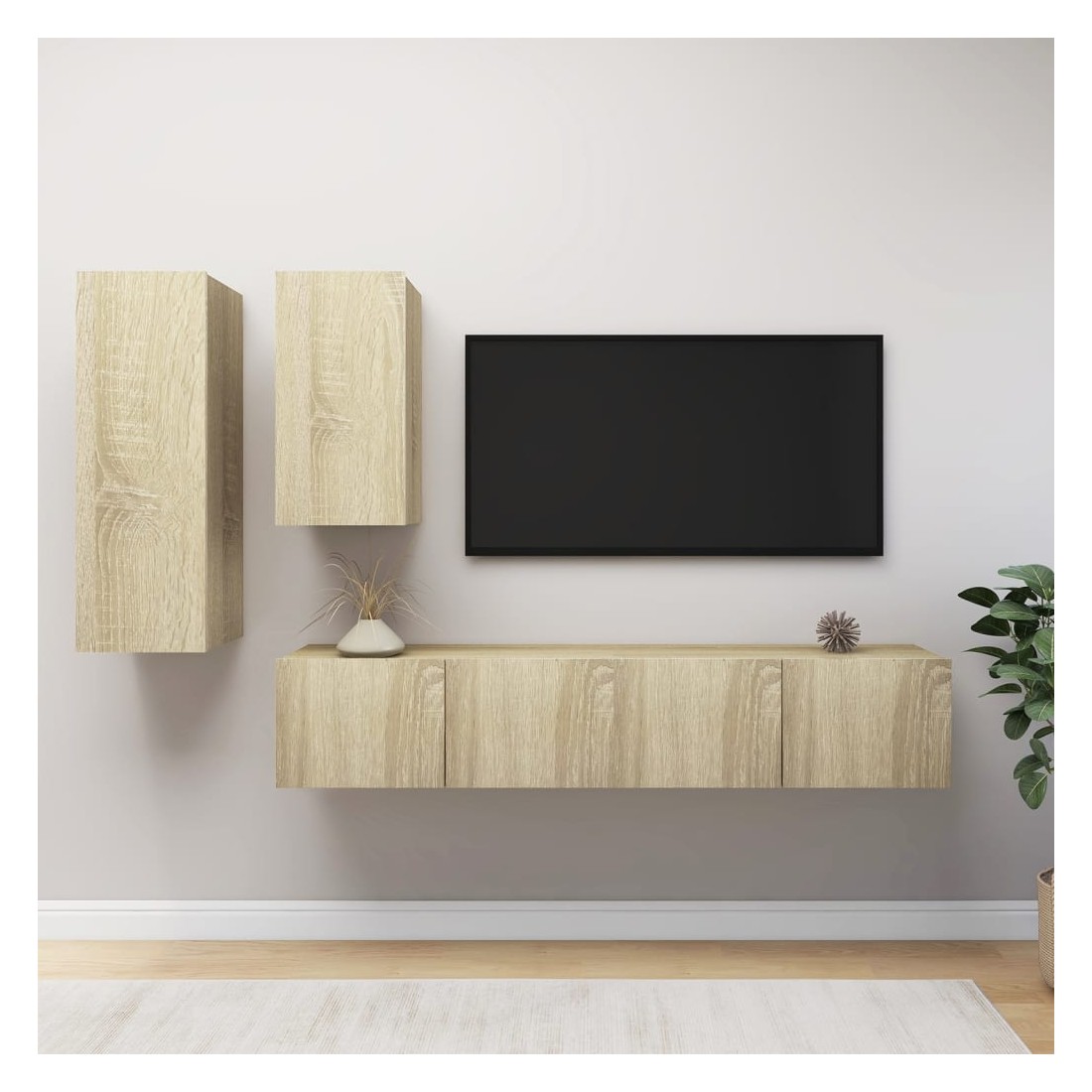 Ce meuble TV, doté d'un design moderne et d'un grand espace de rangement, devient un point de mire de votre salon. Cet ensemble de meuble TV suspendu est fabriqué en bois d'ingénierie, ce qui le rend robuste et durable. L'ensemble est fixé au mur, ce qui en fait un supplément intemporel à votre maison. L’ensemble dispose de plusieurs compartiments qui en font un endroit idéal pour stocker tous vos magazines, DVD ou autres articles. Cet ensemble de meuble Hifi est facile à nettoyer avec un chiffon humide.