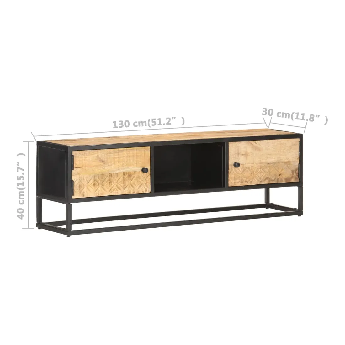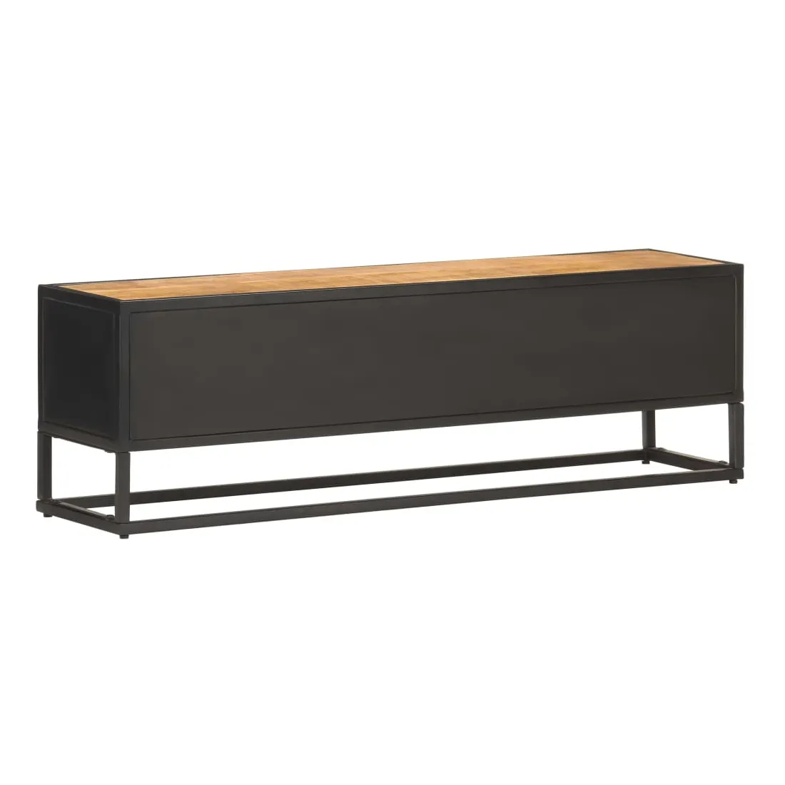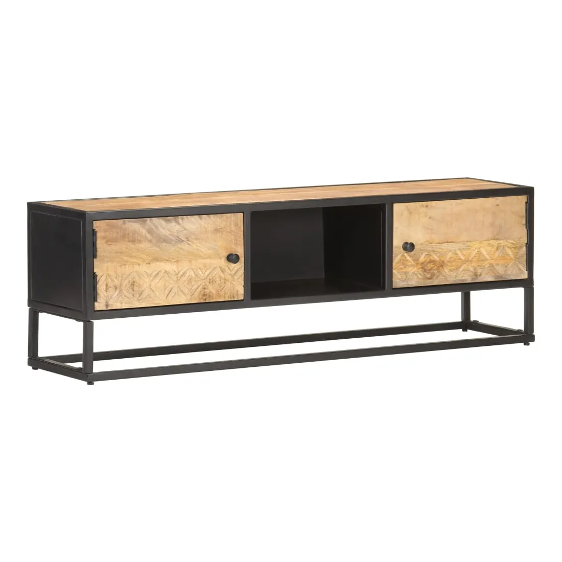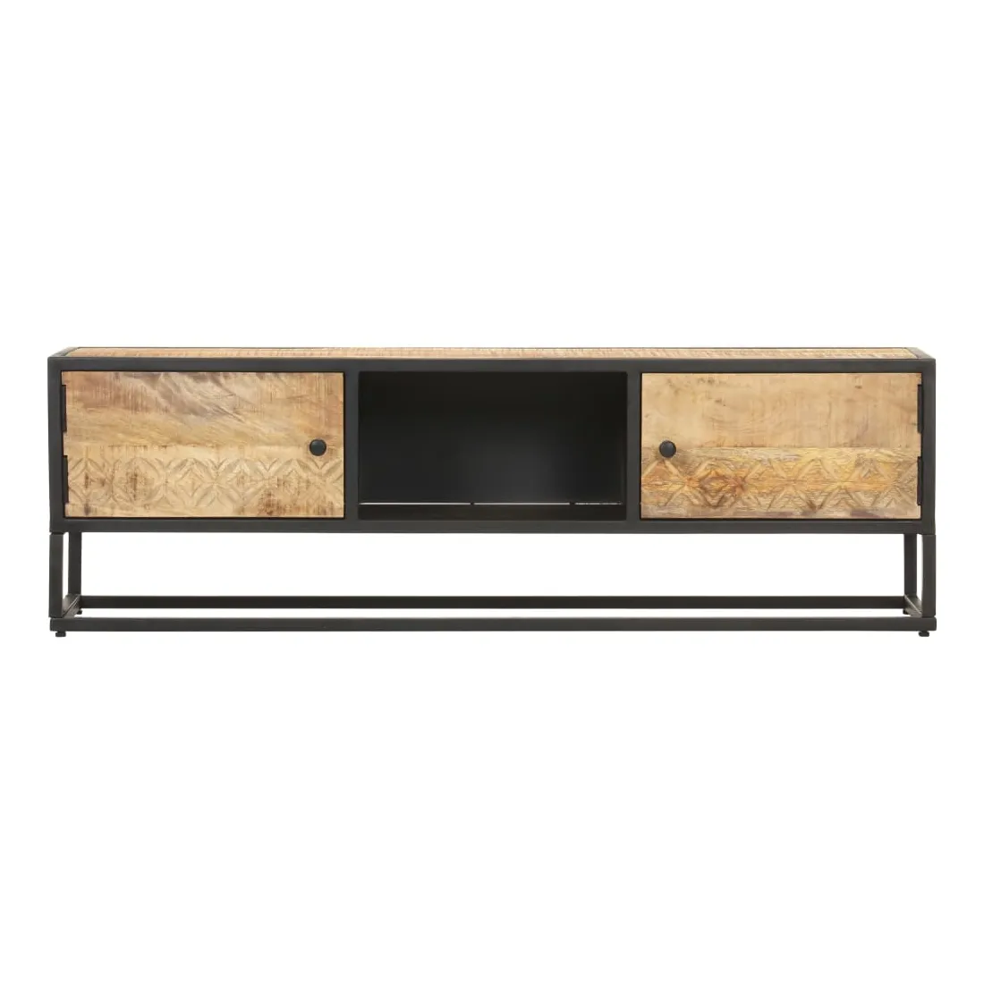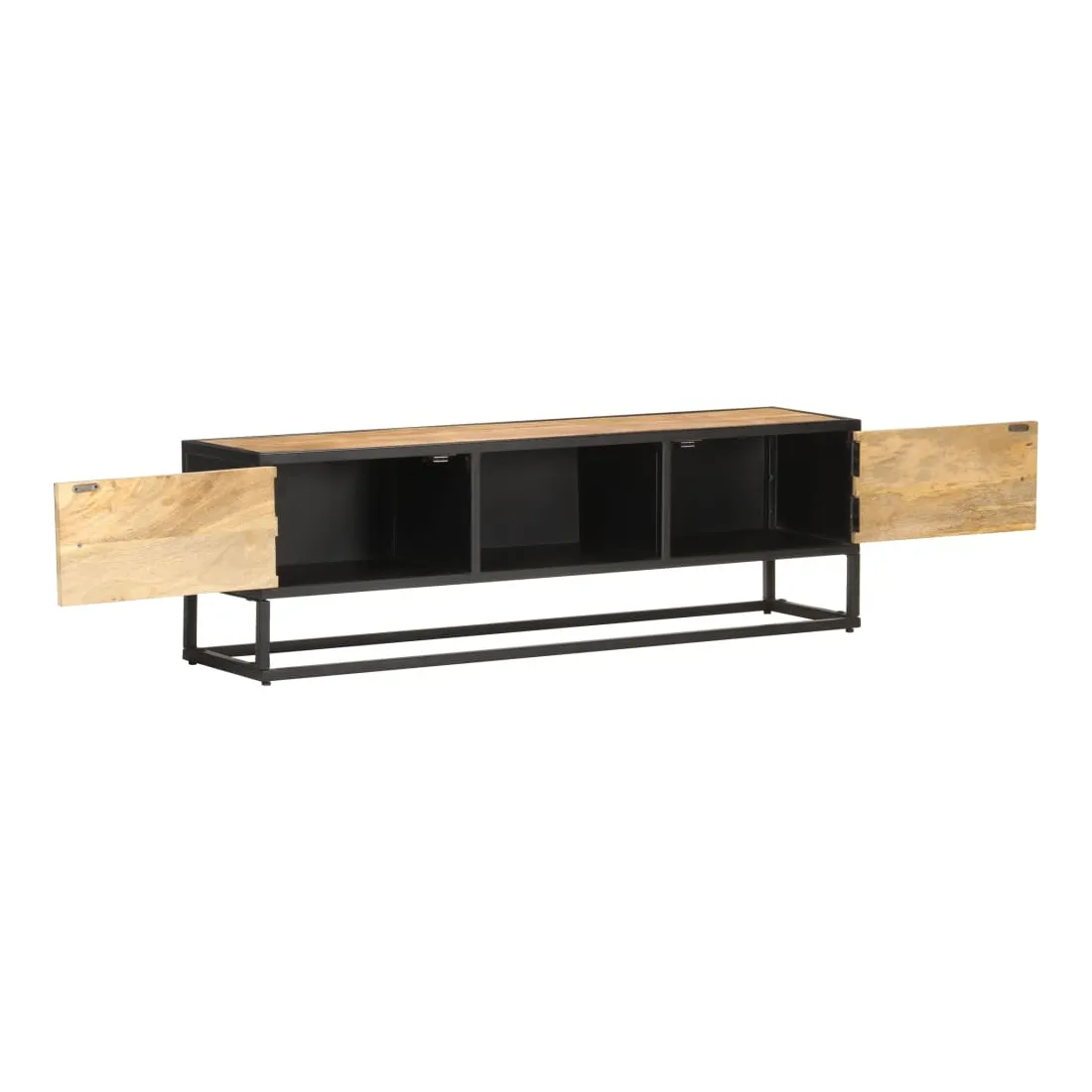 Ce meuble TV dégage un charme rustique. Il est un ajout vraiment pratique et captivant à votre intérieur. Ce meuble HiFi est fabriqué en bois de manguier brut, un bois dur à grains denses. Le bois brut de manguier possède la force nécessaire pour soutenir le poids, et résiste également à l'usure du temps. Ainsi, ce buffet au design magnifique est extrêmement stable, durable et captivant. Ce meuble stéréo est entièrement fabriqué à la main et les grains de bois esthétiquement attrayants rendent chaque meuble unique et légèrement différent l'un de l'autre. De plus, le cadre en fer enduit de poudre ajoute à sa robustesse. Cette armoire comprend 2 portes et 3 compartiments, offrant un grand espace pour ranger vos appareils multimédias, vos livres, vos chaussures ainsi que d’autres articles. Remarque importante : les couleurs varient d'une pièce à l'autre, rendant chaque meuble unique. La livraison est également aléatoire.