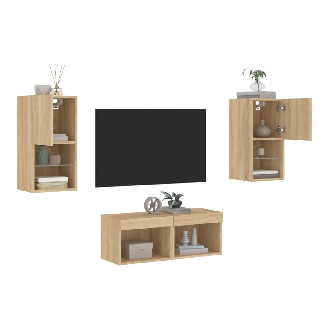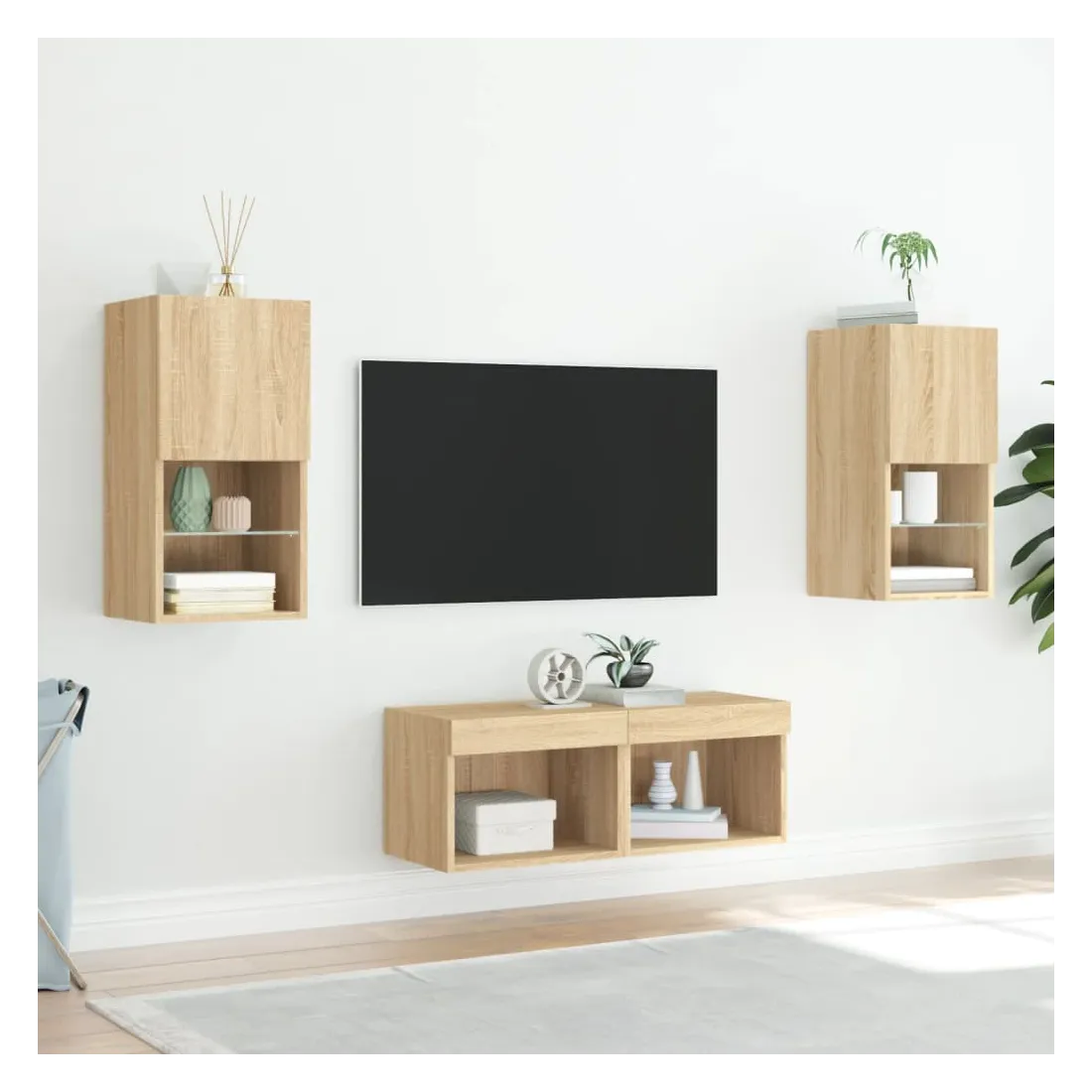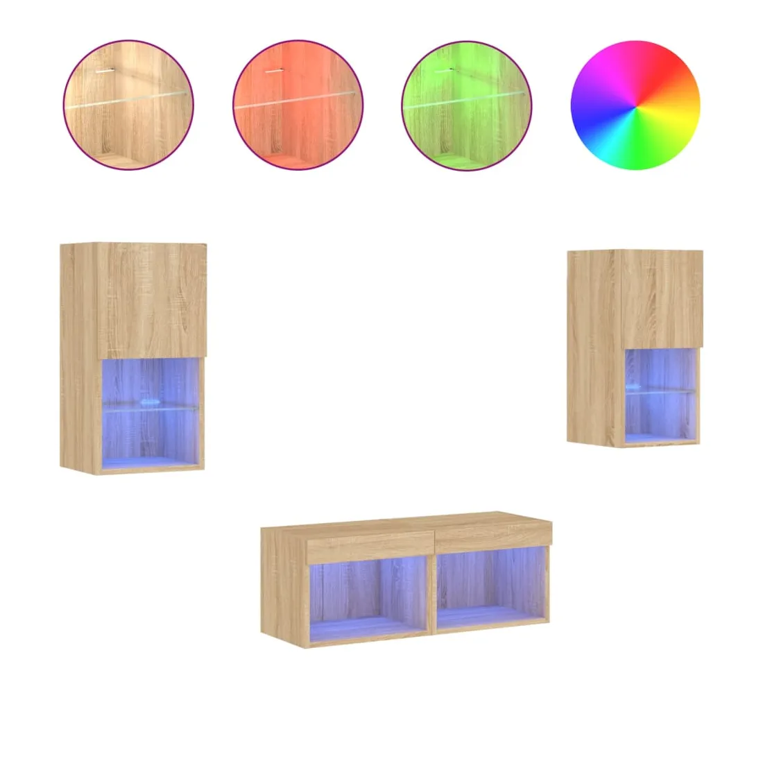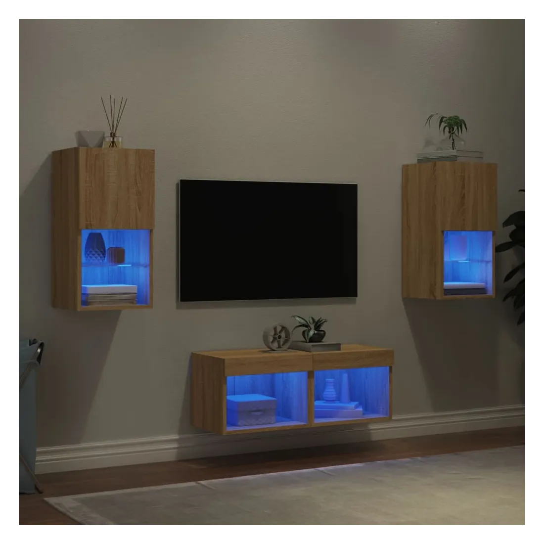 Ces armoires TV murales avec lumières LED sont la solution parfaite pour votre espace de vie afin de maximiser l'espace et de garder les surfaces au sol sans encombrement. Matériau durable : le bois d'ingénierie est d'une qualité exceptionnelle avec une surface lisse et présente également résistance, stabilité et résistance à l'humidité. Fabriqués en bois d'ingénierie, ces meubles TV flottants sont robustes et durables.Grand espace de rangement : les meubles TV muraux disposent d'un grand espace de rangement pour placer vos lecteurs DVD, livres, magazines ou autres objets décoratifs.Lumières LED RVB : les unités multimédia murales sont équipées d'éclairages LED RVB. Avec divers menus personnalisables, vous pouvez changer sans effort la couleur des lumières et même les régler automatiquement.Design mural : ces meubles TV avec rangement peuvent être fixés au mur pour ajouter de l'espace de stockage supplémentaire. De cette façon, vous pouvez maximiser votre espace au sol et garder la zone propre. Bon à savoir :Les vis et les chevilles pour l'intérieur du mur ne sont pas incluses. Nous vous conseillons de trouver et d'utiliser des vis et des chevilles adaptées spécifiquement à vos murs. Si vous n'êtes pas sûr, vous pouvez consulter un professionnel. Veuillez lire et suivre chaque étape des instructions.Ce produit est doté d'un connecteur USB qui nécessite une source d'alimentation USB de 5V certifiée (non incluse).