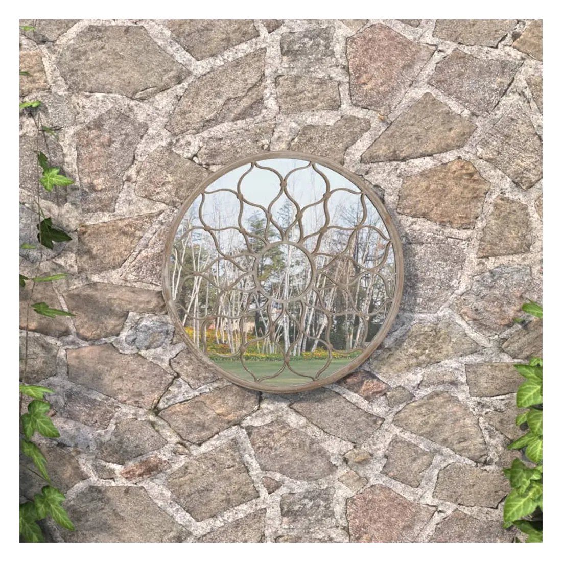 Le miroir rond de jardin sera un supplément original et attrayant à l'espace extérieur. Le cadre du miroir est en fer, ce qui le rend durable et stable. Le motif floral décoratif permet de l'utiliser à l'extérieur. Il peut être utilisé pour mettre en valeur un élément du jardin en le reflétant dans le miroir, ou l'utiliser pour dévier la lumière dans un coin sombre. Un miroir dans le jardin est une façon créative d'améliorer l'apparence et de rendre le jardin plus grand. Grâce au trou pré-percé sur son dessus, le miroir décoratif peut être facilement monté sur le mur.