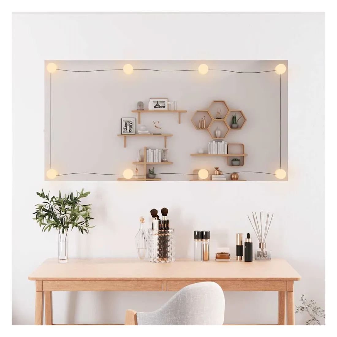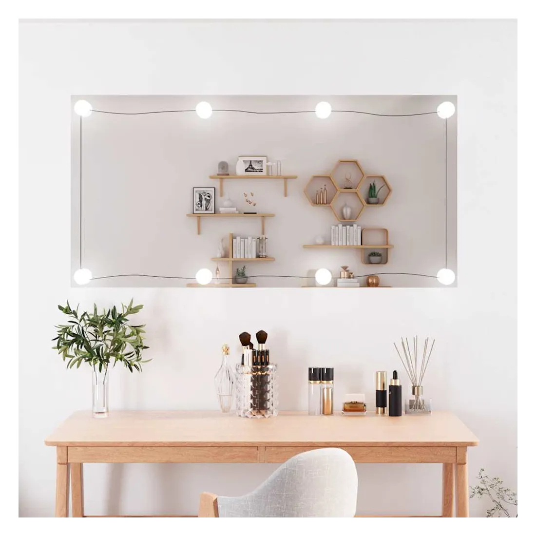 Le miroir mural élégant avec lumières LED ajoute une touche de style contemporain et fournit une lumière vive à votre pièce ! Design mural : le miroir est équipé de pinces pour le montage mural, ce qui le rend particulièrement adapté aux pièces avec un espace limité.Image claire : le miroir de maquillage offre une image claire. Ainsi, vous pouvez profiter d'un reflet magnifique et naturel lorsque vous vous tenez devant le miroir de courtoisie.Différents modes de couleur : la lumière du miroir de courtoisie a différents modes de couleur pour répondre à vos besoins en fonction de la situation. Une température de couleur blanche chaude est confortable et accueillante, tandis que le blanc froid contribue à la vigilance et à la sécurité.Interface USB pratique : les lumières LED sont équipées d'une interface USB, ce qui les rend très pratiques à utiliser.Usages multiples : vous pouvez utiliser le miroir de décoration pour décorer votre chambre à coucher, armoire, couloir, salon, salle de bain et tout autre endroit où vous avez besoin d'ajouter de la brillance. Bon à savoir :Les vis et les chevilles pour l'intérieur du mur ne sont pas incluses. Nous vous conseillons de trouver et d'utiliser des vis et des chevilles adaptées spécifiquement à vos murs. Si vous n'êtes pas sûr, vous pouvez consulter un professionnel. Veuillez lire et suivre chaque étape des instructions.