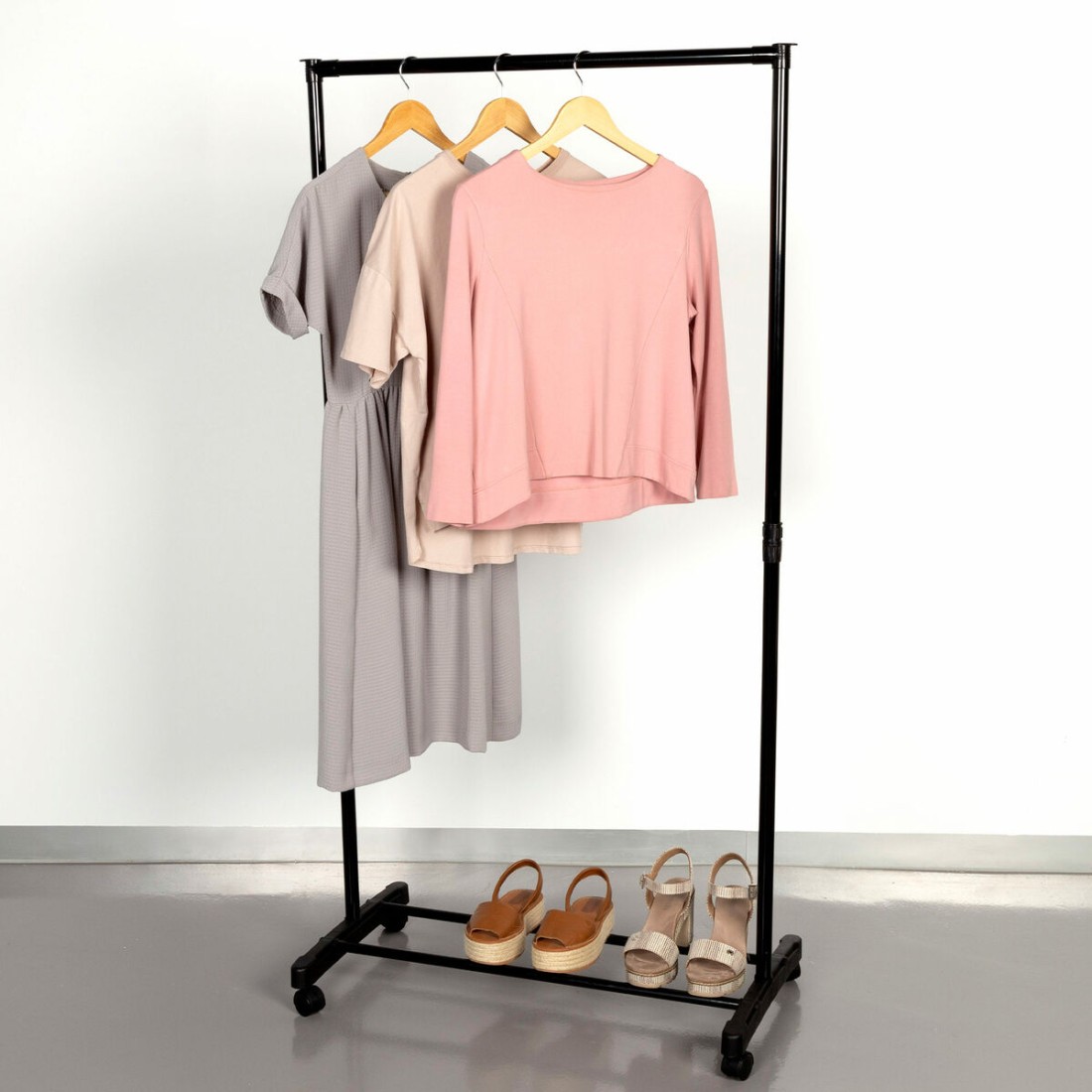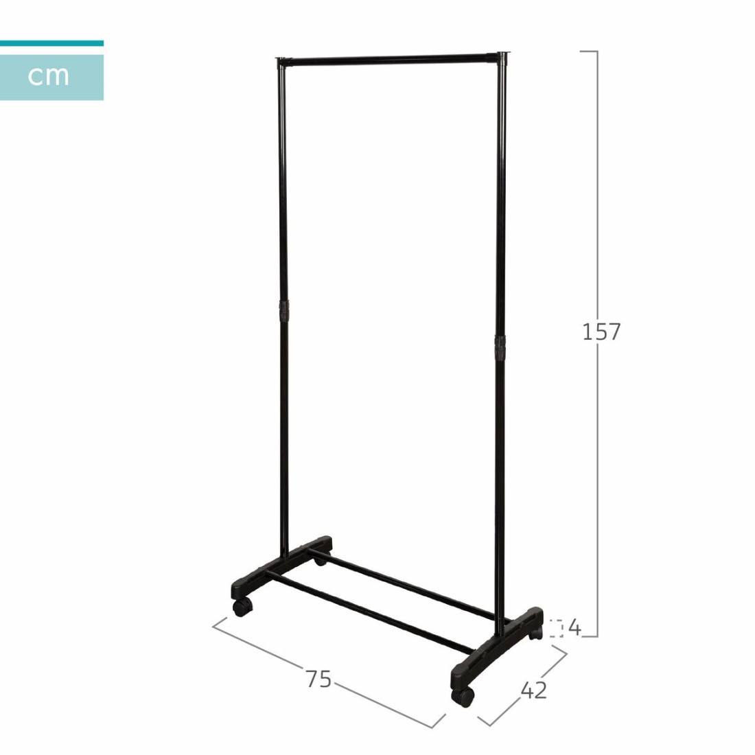 ¿Te falta espacio para organizar tu ropa y accesorios? Este perchero portátil con ruedas es la solución ideal para mantener tus prendas en orden, ya sea en un dormitorio, vestidor o incluso en tiendas o eventos. Con un diseño funcional que incluye barra superior para colgar ropa y estante inferior para colocar calzado, este burro de ropa de 75x42x157 cm es perfecto como solución de almacenaje temporal. Su estética minimalista en color negro se integra a la perfección con el resto de decoración. Soporta hasta 8 kg y está equipado con ruedas para facilitar su desplazamiento (2 de ellas con bloqueo para garantizar que se mantenga firme allí donde decidas colocarlo).