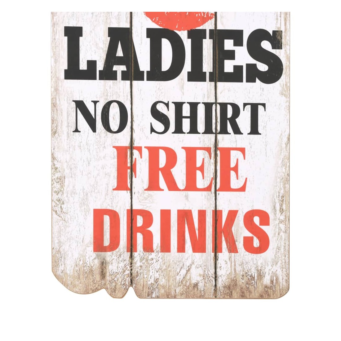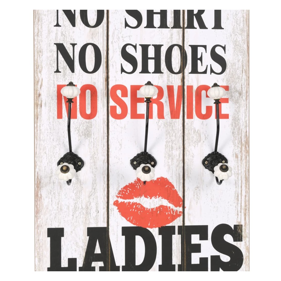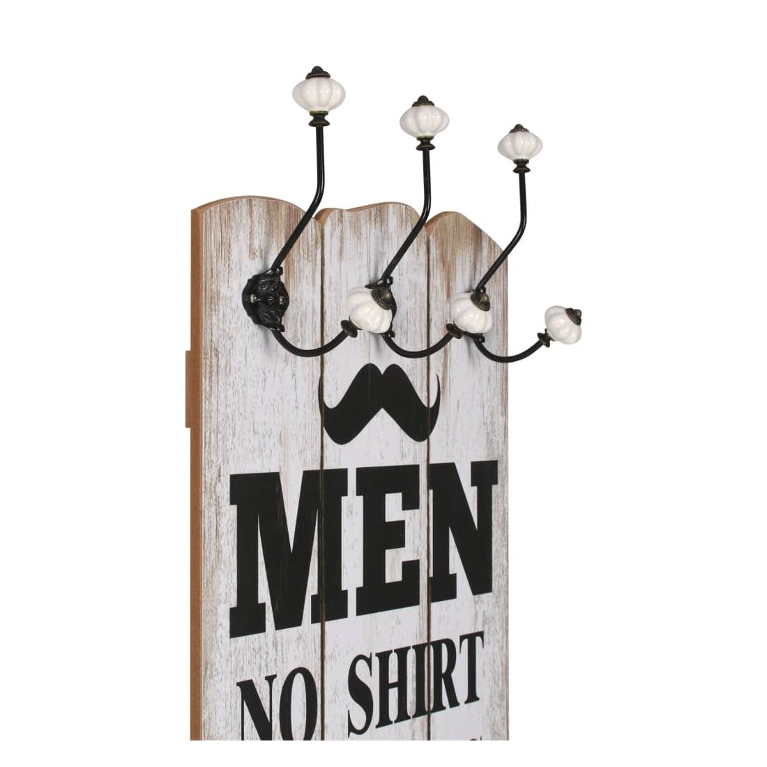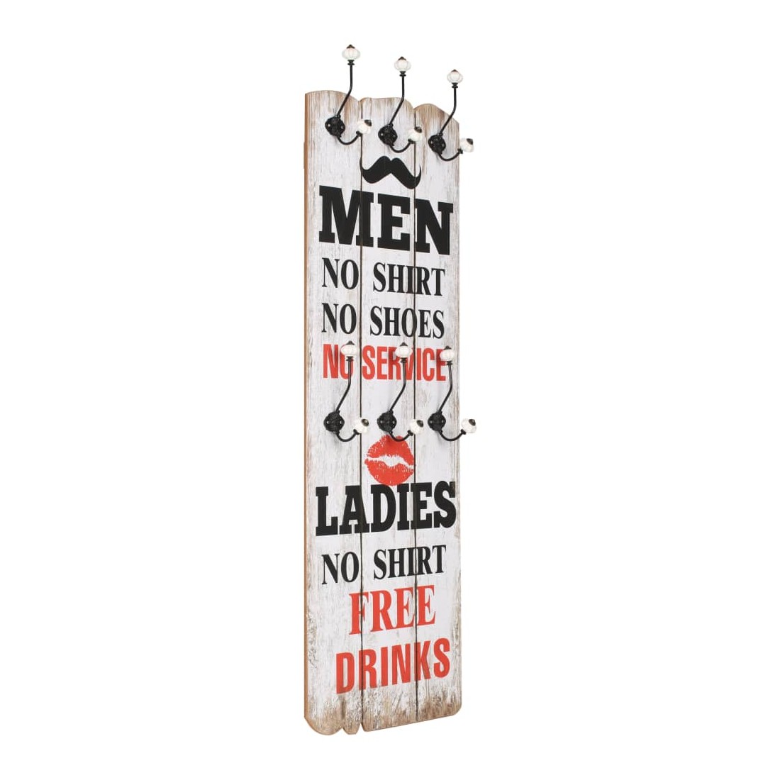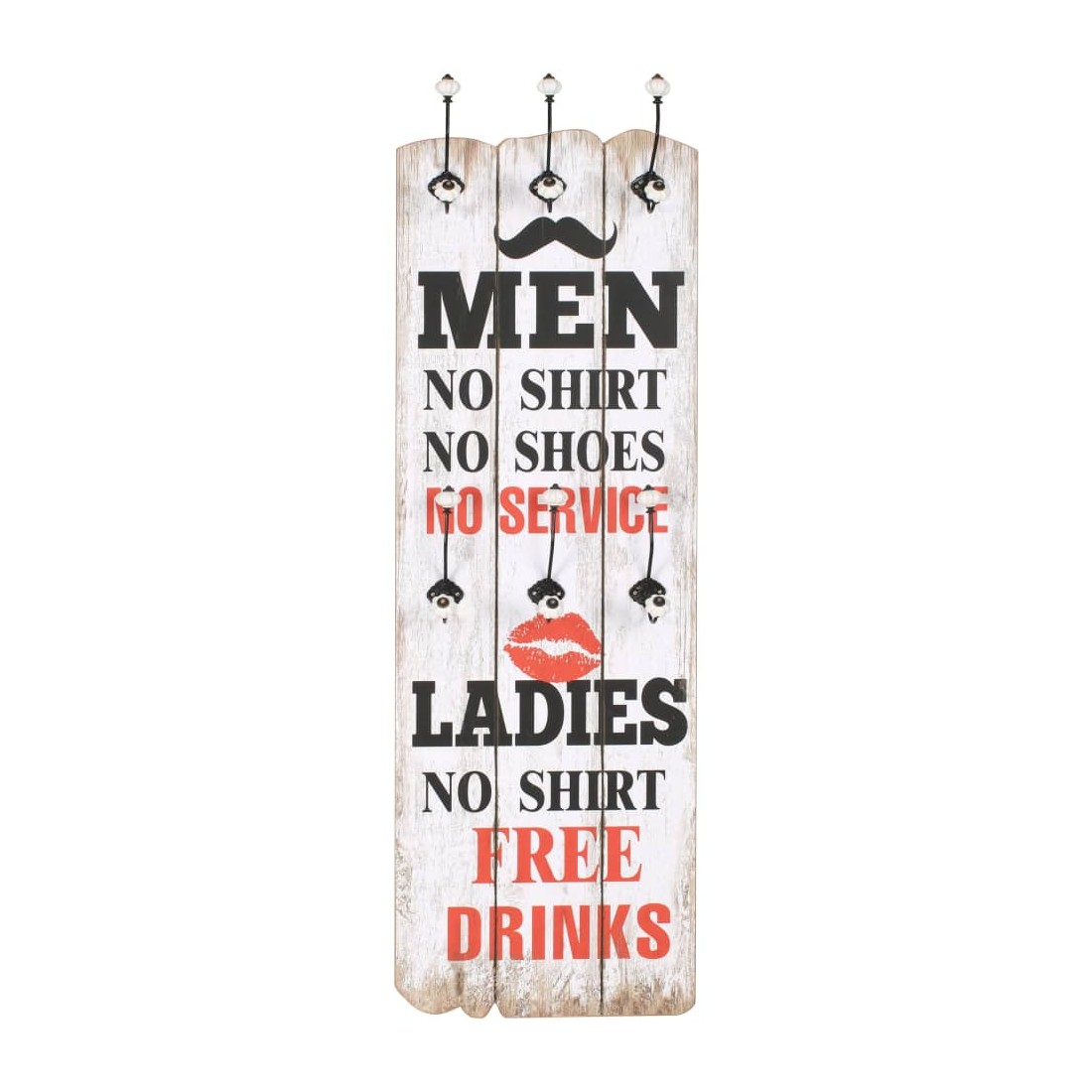 Avec son imprimé de style vintage qui affiche « Men no shirt no shoes no service ladies no shirt free drinks », ce porte-manteau mural avec 6 crochets deviendra un véritable article attrayant que vos invités remarqueront immédiatement. Le porte-manteau est fabriqué en MDF, ce qui est très robuste. Conçu avec deux rangées de trois crochets en métal exquis, le porte-manteau offre amplement d'espace pour vos manteaux, sacs, foulards, chapeaux ou autres petits objets. Avec deux points d'attache à l'arrière, le porte-manteau peut être facilement monté sur le mur. L' assemblage est facile. La livraison comprend également le matériel de montage requis.