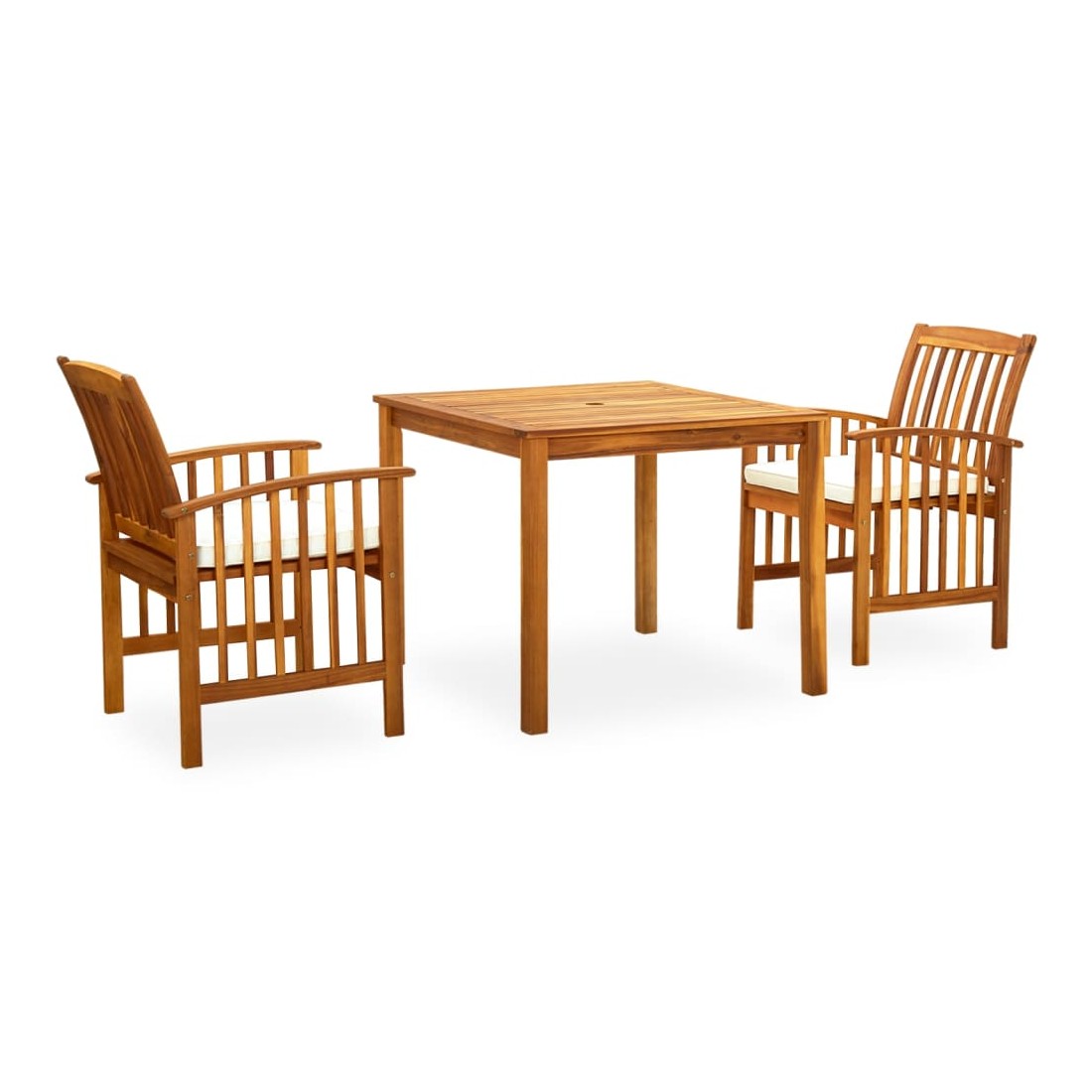 Créez une esthétique convaincante et uniforme dans votre espace extérieur avec cet ensemble de salle à manger de jardin ! La table de salle à manger est en bois d'acacia massif, un bois dur aux grains denses, ce qui la rend robuste, durable et facile à entretenir. Le dessus en bois peut être utilisé pour placer des aliments, des boissons et d'autres articles. Dotées d'un cadre en bois avec une finition à l'huile, ces chaises de salle à manger apportent un look classique à votre terrasse ou à votre arrière-cour tout en donnant à votre espace extérieur une sensation naturelle. Les coussins bien rembourrés ajoutent également un confort d'assise supplémentaire pendant votre temps de détente. De plus, cet ensemble est facile à nettoyer avec un chiffon humide. Remarque : afin de prolonger la durée de vie des meubles d'extérieur, nous vous recommandons de les protéger avec une housse imperméable.