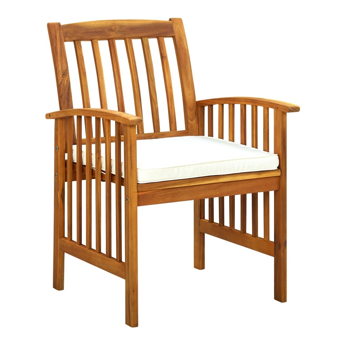 Créez une esthétique convaincante et uniforme dans votre espace extérieur avec cet ensemble de salle à manger de jardin ! La table de salle à manger est en bois d'acacia massif, un bois dur aux grains denses, ce qui la rend robuste, durable et facile à entretenir. Le dessus en bois peut être utilisé pour placer des aliments, des boissons et d'autres articles. Dotées d'un cadre en bois avec une finition à l'huile, ces chaises de salle à manger apportent un look classique à votre terrasse ou à votre arrière-cour tout en donnant à votre espace extérieur une sensation naturelle. Les coussins bien rembourrés ajoutent également un confort d'assise supplémentaire pendant votre temps de détente. De plus, cet ensemble est facile à nettoyer avec un chiffon humide. Remarque : afin de prolonger la