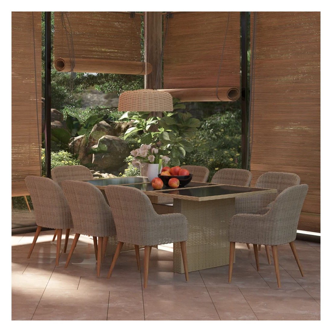 Cet ensemble de salle à manger de jardin au design élégant est un excellent choix pour dîner ou vous détendre dans le jardin ou sur la terrasse ! L'ensemble de meubles d'extérieur est doté d’un cadre solide en acier enduit de poudre qui le rend très stable et durable. Grâce à la résine tressée résistante aux intempéries, cet ensemble de salle à manger est facile à nettoyer, résistant à l'usure et convient à une utilisation quotidienne à l'extérieur. Le dessus de table en verre est également facile à nettoyer avec un chiffon humide. De plus, les coussins de siège doux inclus ajoutent également du confort supplémentaire à l'ensemble. Les housses de coussin en polyester à faible entretien peuvent être facilement retirées et lavées. Remarque : nous vous recommandons de couvrir l'ensemble p