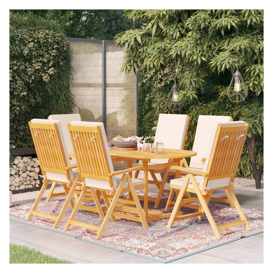 vidaXLCet ensemble de jardin en bois est parfait pour vos repas ou pour vous détendre dans le jardin ou sur le patio. Il est également idéal pour une utilisation à l'intérieur. Fabriquée en bois dur de teck extrêmement durable, cette pièce de meuble en teck a été chevronnée, séchée au four puis finement poncée pour lui donner un aspect très lisse. Le bois de teck est connu pour sa résistance exceptionnelle aux intempéries, ce qui le rend bien plus adapté aux meubles de jardin que tout autre type de bois. Le bois de teck est le choix idéal si vous souhaitez acheter une pièce de meubles de jardin durable. L’ensemble est appliqué avec une belle finition pour donner au bois une couleur chaude. La table comprend un trou pour un parasol afin de vous protéger du soleil. Les dossiers des chaises sont réglables en 5 positions, de sorte que vous puissiez toujours trouver les positions les plus confortables. Avec un design pliable, les chaises peuvent être pliées pour économiser de l’espace lorsqu'elles ne sont pas utilisées. Elles sont également légères et faciles à déplacer. Les coussins bien rembourrés offrent le plus grand confort et les housses de coussin sont amovibles pour un lavage facile. L’ensemble de meubles vous offre un confort et une grande commodité pour passer du temps avec votre famille et vos amis. De plus, cet ensemble est également facile à nettoyer avec un chiffon humide.