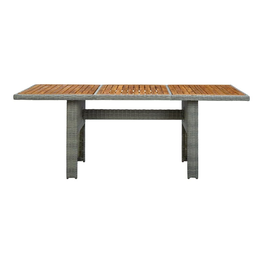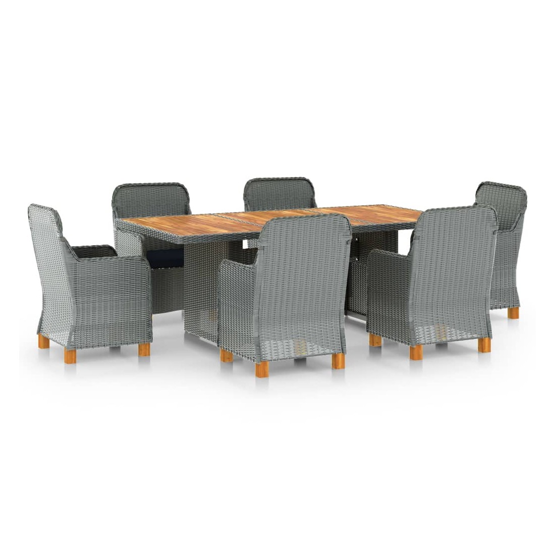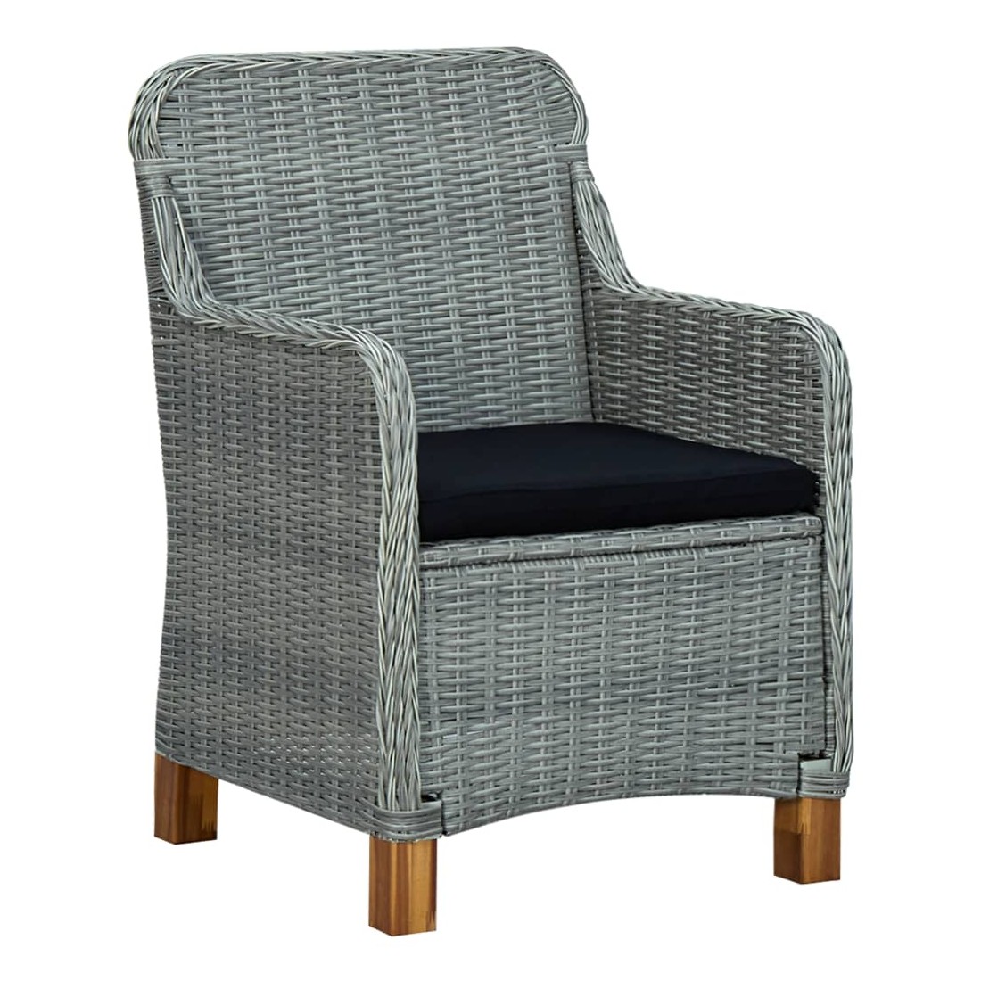 vidaXLCet ensemble à manger d'extérieur est une combinaison parfaite de style et de fonctionnalité et est destiné à être le point de mire de votre jardin, balcon ou patio. L’ensemble de meubles est fait de résine tressée ronde légère et peu exigeante d’entretien, ce qui le rend parfait pour une utilisation à l'extérieur, facile à nettoyer avec un chiffon humide. Grâce à la structure en acier enduit de poudre, les fauteuils et la table sont stables et durables. Le dessus de table solide est parfait pour placer ou afficher vos différents essentiels. Les coussins bien rembourrés ajoutent du confort supplémentaire pendant votre temps de détente. La housse de coussin est équipée d'une fermeture éclair, amovible et lavable. De plus, les pieds en bois d’acacia massif ajoutent à la robustesse et à la stabilité des chaises. Cet ensemble de meubles est facile à déplacer grâce à la construction légère. Remarque : Nous vous recommandons de couvrir l'ensemble pendant la pluie, la neige ou le gel.