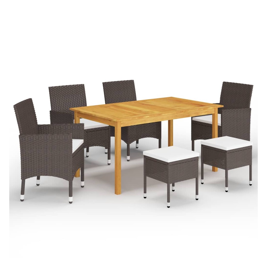 Créez une esthétique convaincante et uniforme dans votre espace extérieur avec cet ensemble de salle à manger de jardin ! La table de salle à manger est en bois d’acacia massif avec une finition à l’huile, ce qui la rend stable, durable et facile à entretenir. Dotés d’un cadre en acier enduit de poudre recouvert de résine tressée résistante aux intempéries, ces chaises et tabourets sont robustes et faciles à nettoyer. Conçue avec un dossier et des accoudoirs incurvés, la chaise à dîner a une forme plus ergonomique pour un confort maximal. Chaque siège est doté d'un coussin rembourré amovible pour ajouter du confort pendant votre temps de détente. Remarque importante : Nous vous recommandons de couvrir l'ensemble de salle à manger pendant la pluie, la neige et le gel pour une utilisation durable.