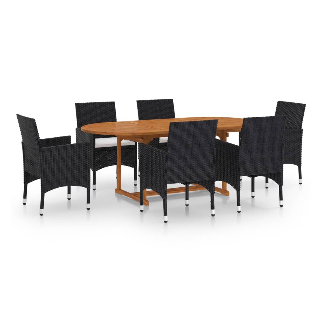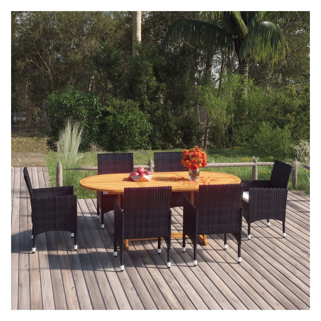 Créez une esthétique convaincante et uniforme dans votre espace extérieur avec cet ensemble de salle à manger de jardin ! La table à manger est fabriquée en bois d’acacia massif, ce qui la rend robuste et stable. La surface à finition à l'huile la rend également adaptée pour une utilisation en extérieur. Dotées d’un cadre en acier recouvert de résine tressée résistante aux intempéries, les chaises sont robustes et faciles à nettoyer. Les coussins bien rembourrés ajoutent également un confort d’assise supplémentaire à votre temps de détente. Remarque : afin de prolonger la durée de vie des meubles d'extérieur, nous vous recommandons de les protéger avec une housse imperméable.