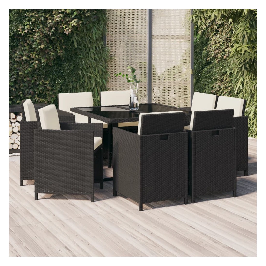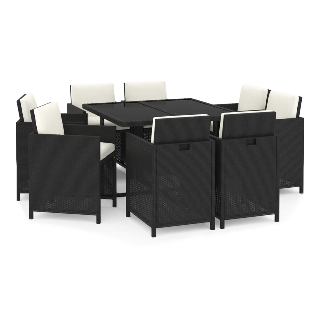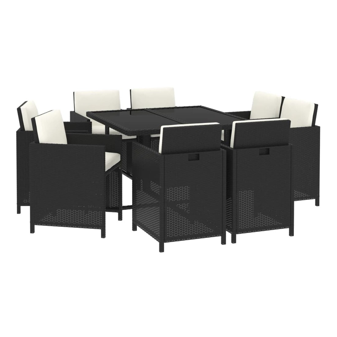 Cet ensemble élégant de salle à manger de jardin vous permet de passer des moments agréables et confortables avec votre famille et vos amis. Fabriqué en résine tressée résistante aux intempéries et imperméable, cet ensemble de salle à manger d'extérieur est facile à nettoyer, résistant à l'usure et adapté à une utilisation quotidienne. Le cadre en acier enduit de poudre rend la table et les chaises robustes et durables. Le dessus de table en verre est idéal pour placer des boissons, de la nourriture ou des objets décoratifs. Les coussins d'assise et de dossier épais et souples, remplis de mousse, ajoutent également au confort d'assise. De plus, vous pouvez tirer le dossier vers le bas et ranger les chaises sous la table, économisant ainsi un espace de rangement précieux lorsque l’ensemble n’est pas utilisé. Grâce à la construction légère, tous les articles sont faciles à déplacer. Remarque : afin de prolonger la durée de vie des meubles d'extérieur, nous vous recommandons de les protéger avec une housse imperméable.