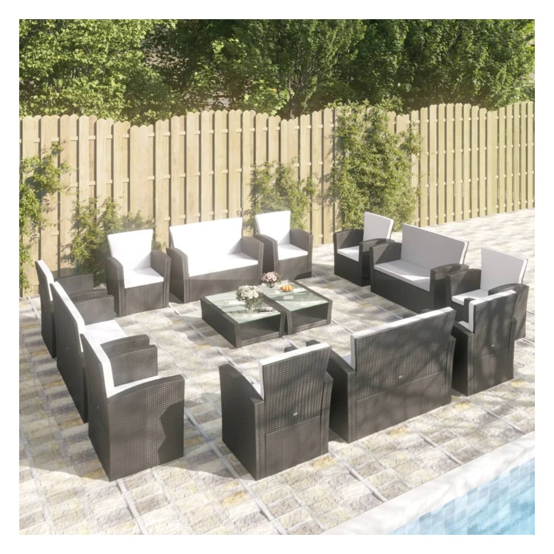 Salon de jardin 16 pcs avec coussins Résine tressée Noir