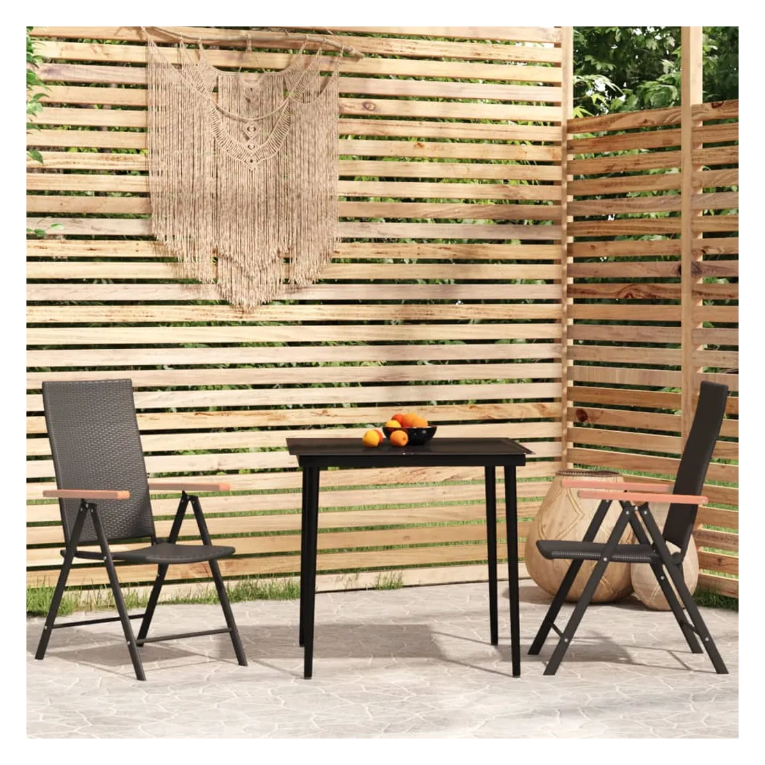 Créez une esthétique convaincante et uniforme dans votre espace extérieur avec cet ensemble de salle à manger de jardin ! Cette table de salle à manger de jardin est faite de cadre en acier enduit de poudre, ce qui la rend robuste et stable pour une utilisation quotidienne à l’extérieur. Le dessus de table en verre lisse est facile à nettoyer avec un chiffon humide et est parfait pour placer des repas, des boissons et d'autres objets décoratifs. Les chaises de patio sont en résine tressée, ce qui les rend légères et résistantes à l’eau. De plus, les dossiers des chaises sont inclinables sur 7 niveaux, ce qui vous permet de toujours trouver la position la plus confortable. Les chaises peuvent être pliées pour gagner de la place lorsqu'elles ne sont pas utilisées. Remarque : nous vous recommandons de couvrir le mobilier pendant la pluie, la neige ou le gel. Remarque : afin de prolonger la durée de vie des meubles d'extérieur, nous vous recommandons de les protéger avec une housse imperméable.