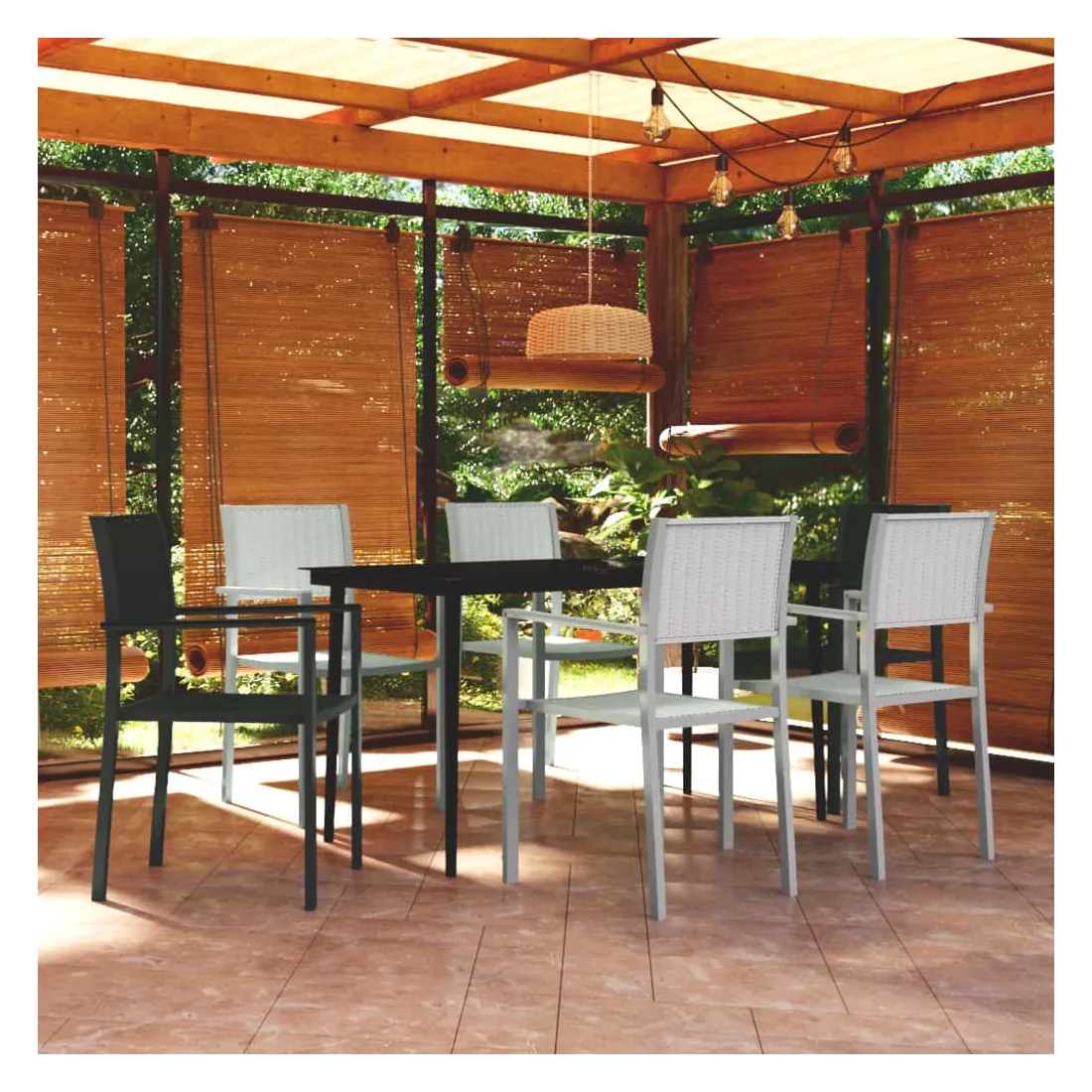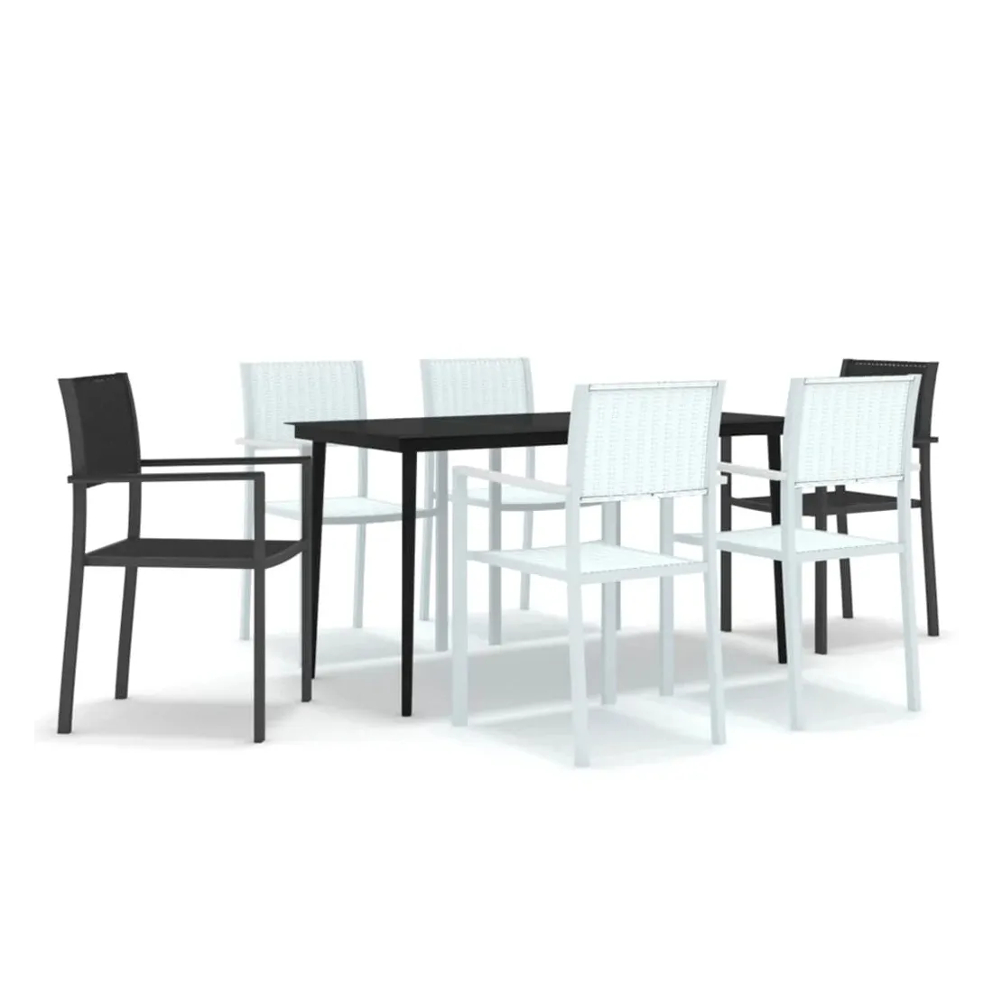 Cet ensemble de salle à manger de jardin est une combinaison parfaite de style et de fonctionnalité et est destiné à être le point de mire de votre jardin, balcon ou patio. Cet ensemble de meubles de patio est fabriqué à partir d'un cadre en acier enduit de poudre, ce qui le rend robuste et stable pour une utilisation quotidienne à l’extérieur. Le dessus de table en verre lisse est facile à nettoyer avec un chiffon humide et parfait pour placer les repas, les boissons et autres articles décoratifs. Les chaises à dîner d'extérieur légères sont fabriquées en plastique, ce qui les rend faciles à nettoyer et à déplacer. Les chaises de salle à manger de jardin, avec leur design d'aspect de rotin, ajoutent une touche de charme naturel à votre espace de vie extérieur ! Remarque : afin de prolonger la durée de vie des meubles d'extérieur, nous vous recommandons de les protéger avec une housse imperméable.
