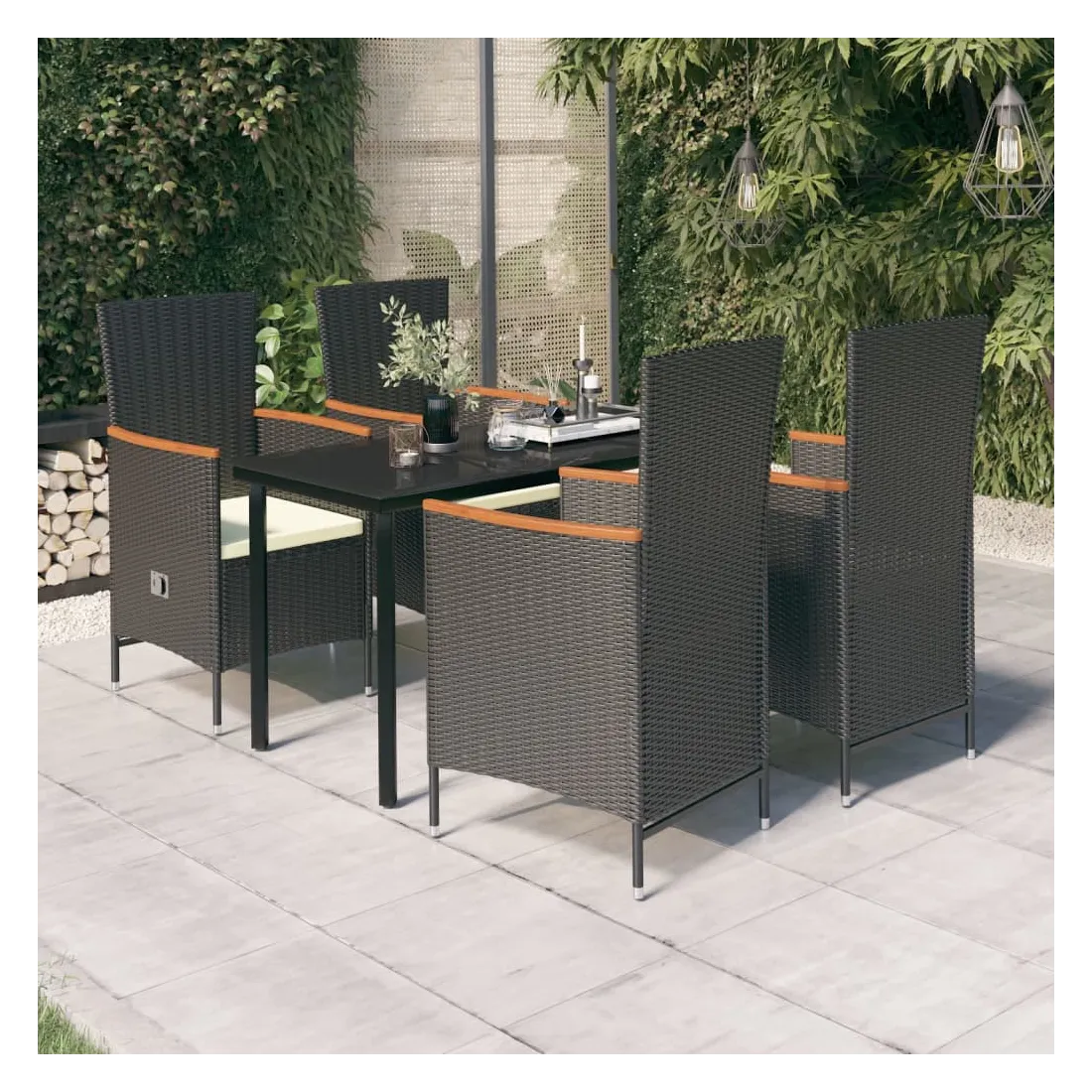 Cet élégant ensemble de salle à manger de jardin est destiné à être le point de mire de votre jardin ou patio ! C'est un excellent choix pour les repas en plein air ou pour vous détendre dans l'espace extérieur ! Les cadres en acier enduit de poudre rendent la table et les chaises robustes et stables pour une utilisation quotidienne à l'extérieur. Grâce à la résine tressée résistante à l'eau, les chaises sont faciles à nettoyer et résistantes à l'usure. Le dossier peut être ajusté en tirant sur le bouton sur le côté. Grâce à leur construction légère, elles sont faciles à déplacer. Les coussins de siège bien rembourrés ajoutent également un confort supplémentaire. Les housses en polyester nécessitant peu d'entretien peuvent être retirées et lavées. De plus, le dessus de table en verre lisse est facile à nettoyer avec un chiffon humide et parfait pour ranger des repas, des boissons et d'autres articles décoratifs. Remarque : afin de prolonger la durée de vie des meubles d'extérieur, nous vous recommandons de les protéger avec une housse imperméable.