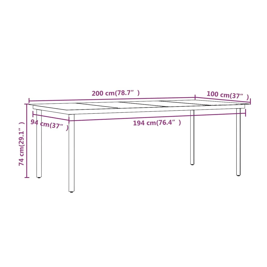 • Dimensions de la table : 200 x 100 x 74 cm (L x l x H)